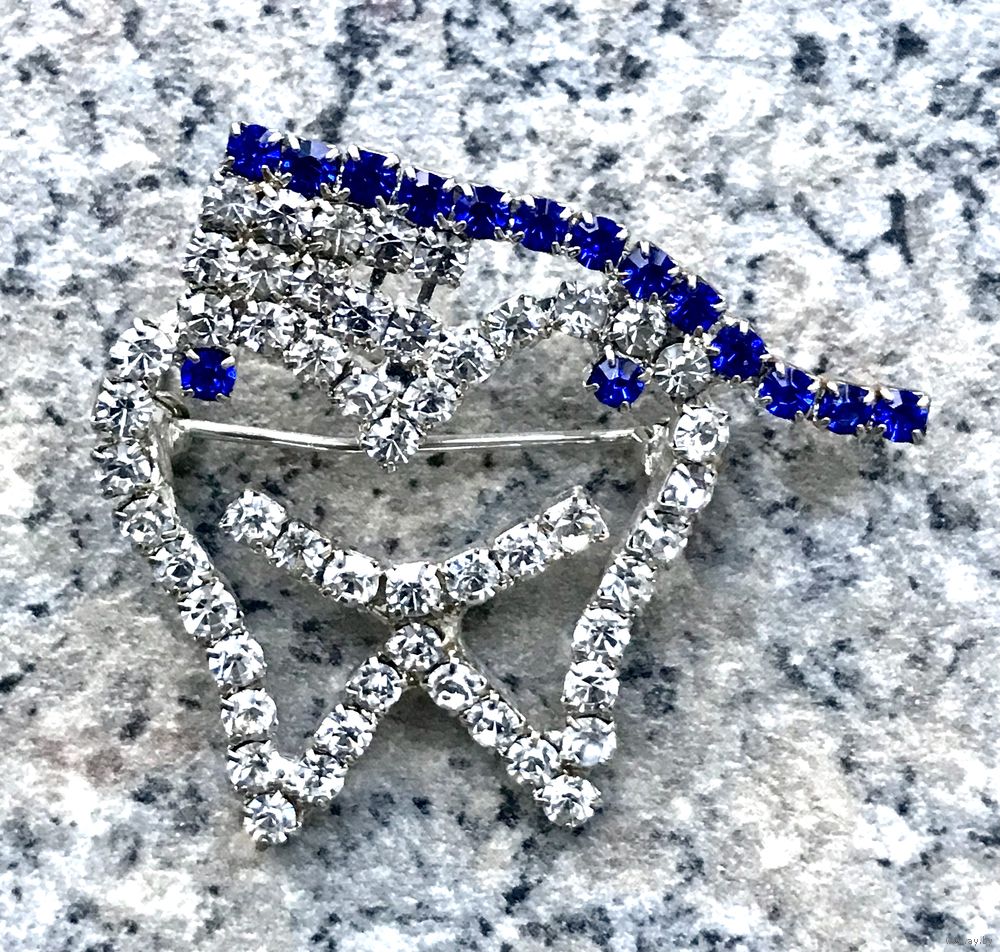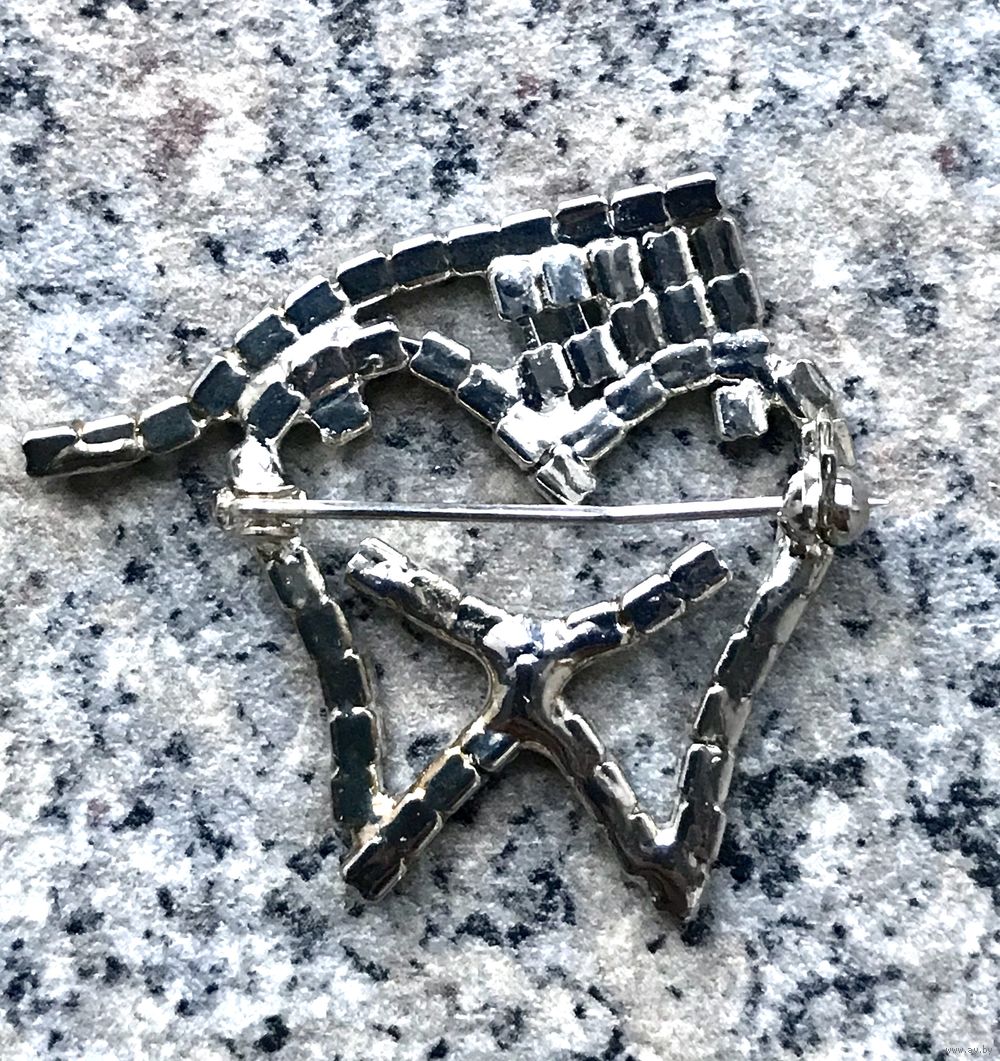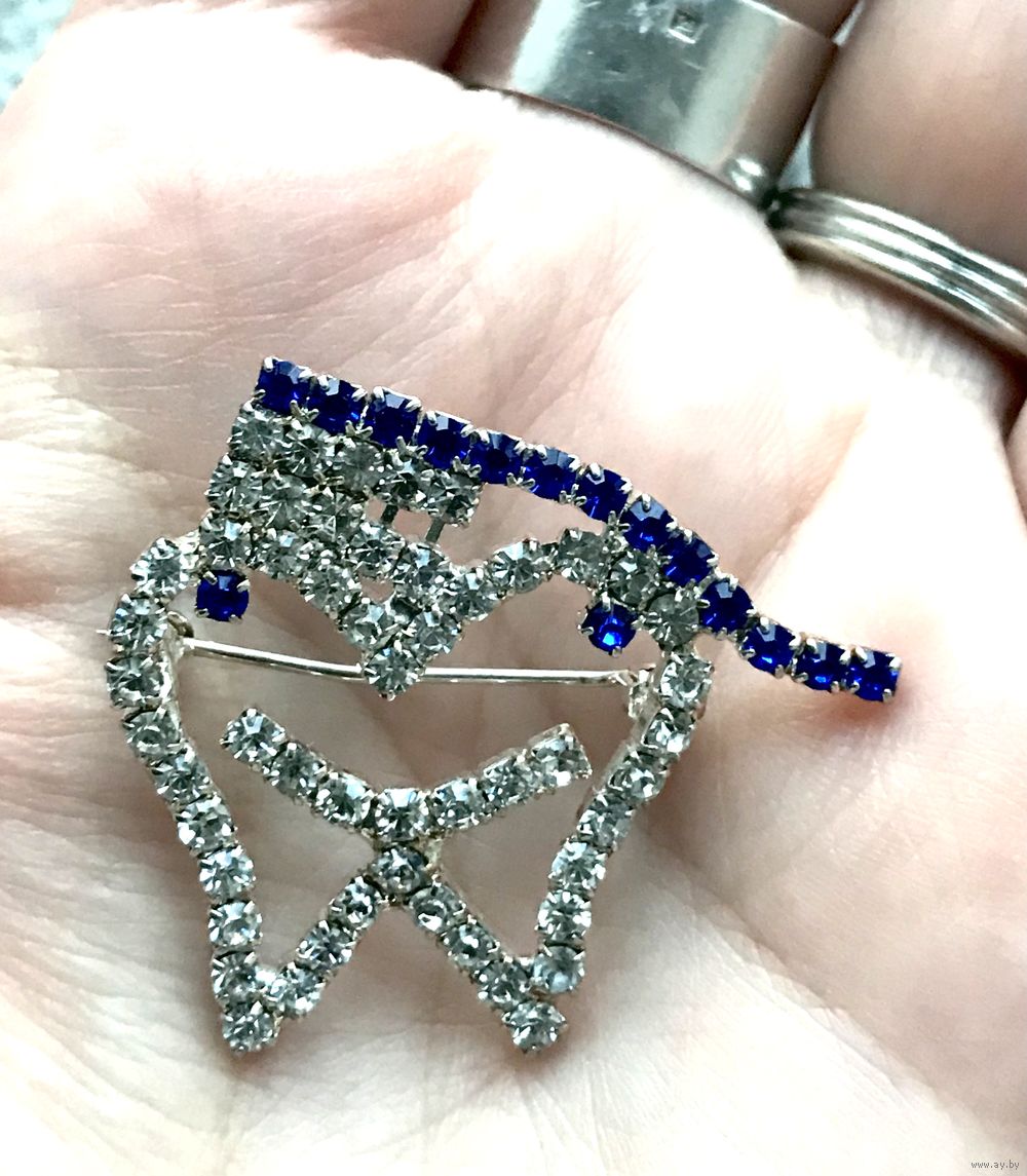 Небольшая (высота 3,2см ширина 3см) унисекс брошь в виде зуба, вставки- кристаллы, основа из металла серебристого тона. Состояние хорошее.