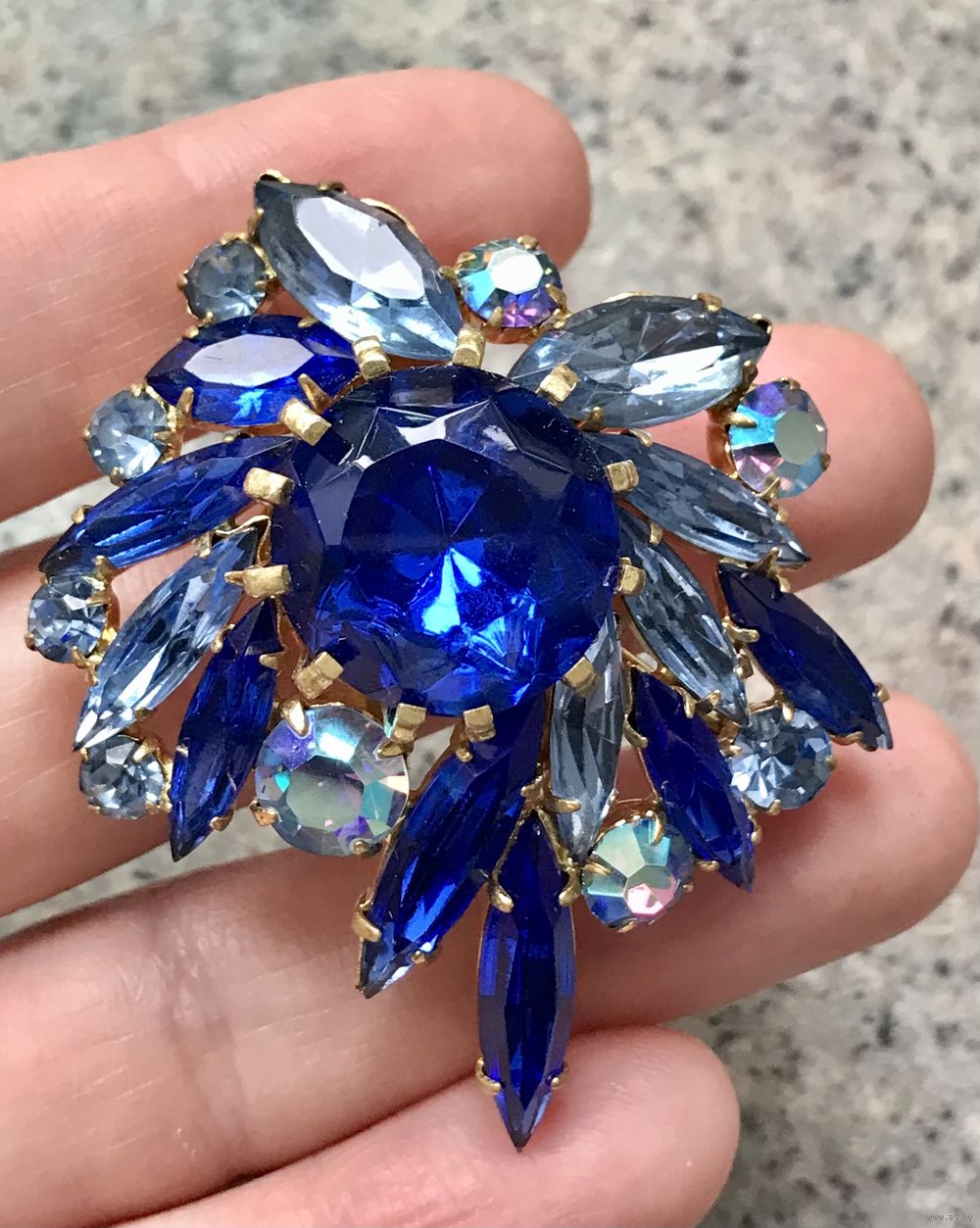 Винтажная крупная чешская брошь с основой из латуни и вставками из цветного стекла и кристаллами с покрытием AB. Размер броши 5,5х4,5см. Немного подвижны несколько вставок. Общее состояние хорошее.