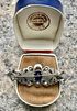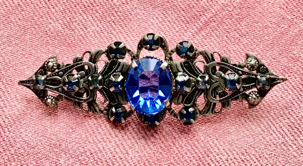 Антикварная брошь (30-50-е гг.) с основой из латуни с серебрением и вставок из стекла насыщенного синего цвета. На металле и центральной вставке имеются незначительные потёртости. Размер броши 6х2см. Для своих лет состояние отличное.