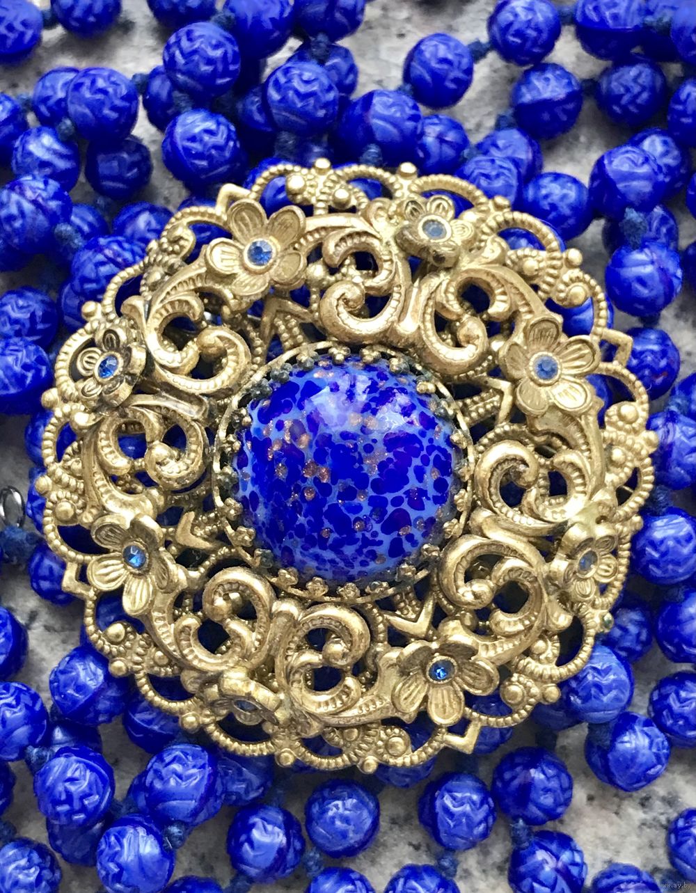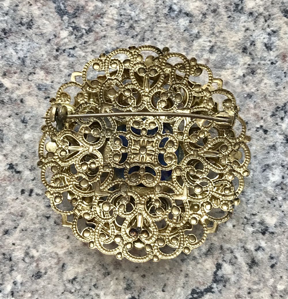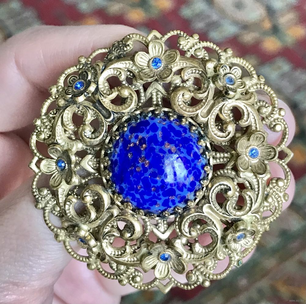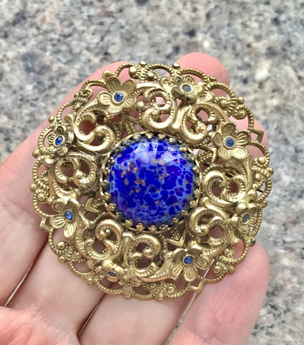 Крупная, эффектная чешская брошь (50-60-е гг.) из латуни с центральной вставкой из художественного стекла под лазурит. Брошь двухуровневая, диаметр 5,2см., диаметр центральной вставки 1,8см. Состояние хорошее.