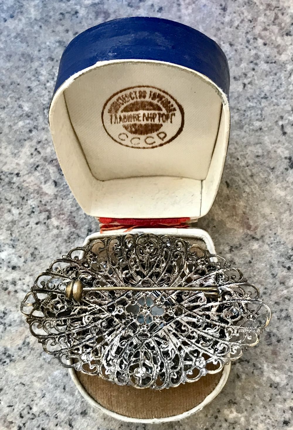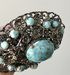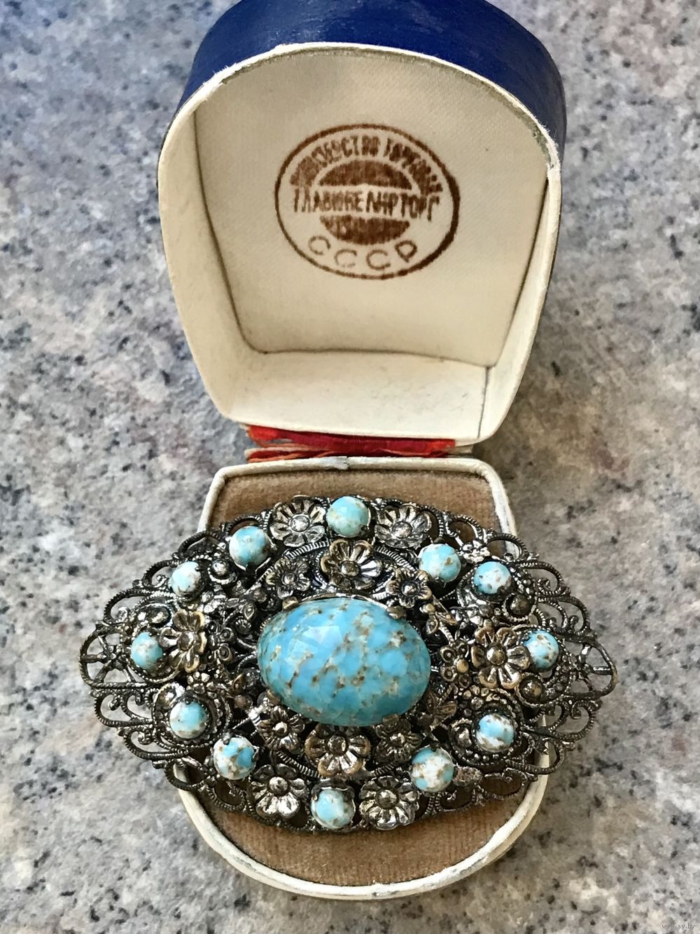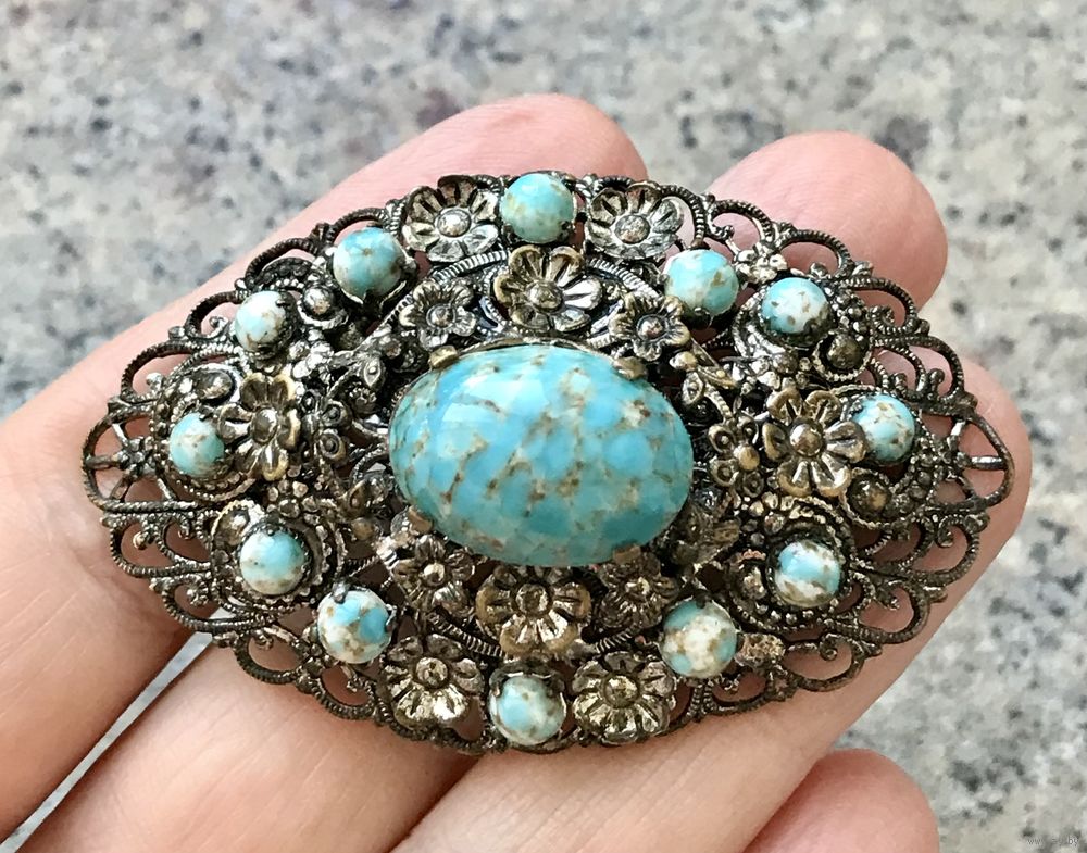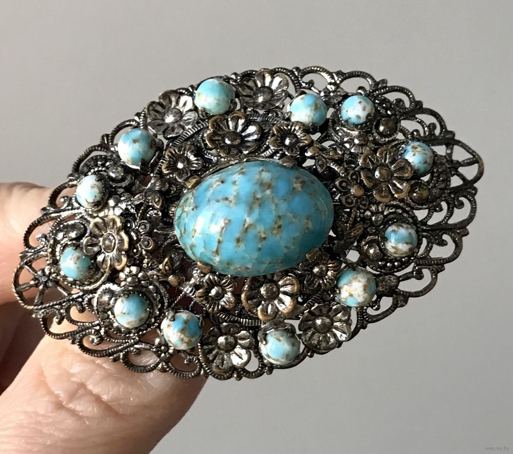 Крупная винтажная брошь с основой из латуни с серебрением и вставок из художественного стекла. На центральной вставке есть незначительный скольчик, на замке нет фиксатора (эти моменты учтены в цене). Размер броши 6х3,5см.