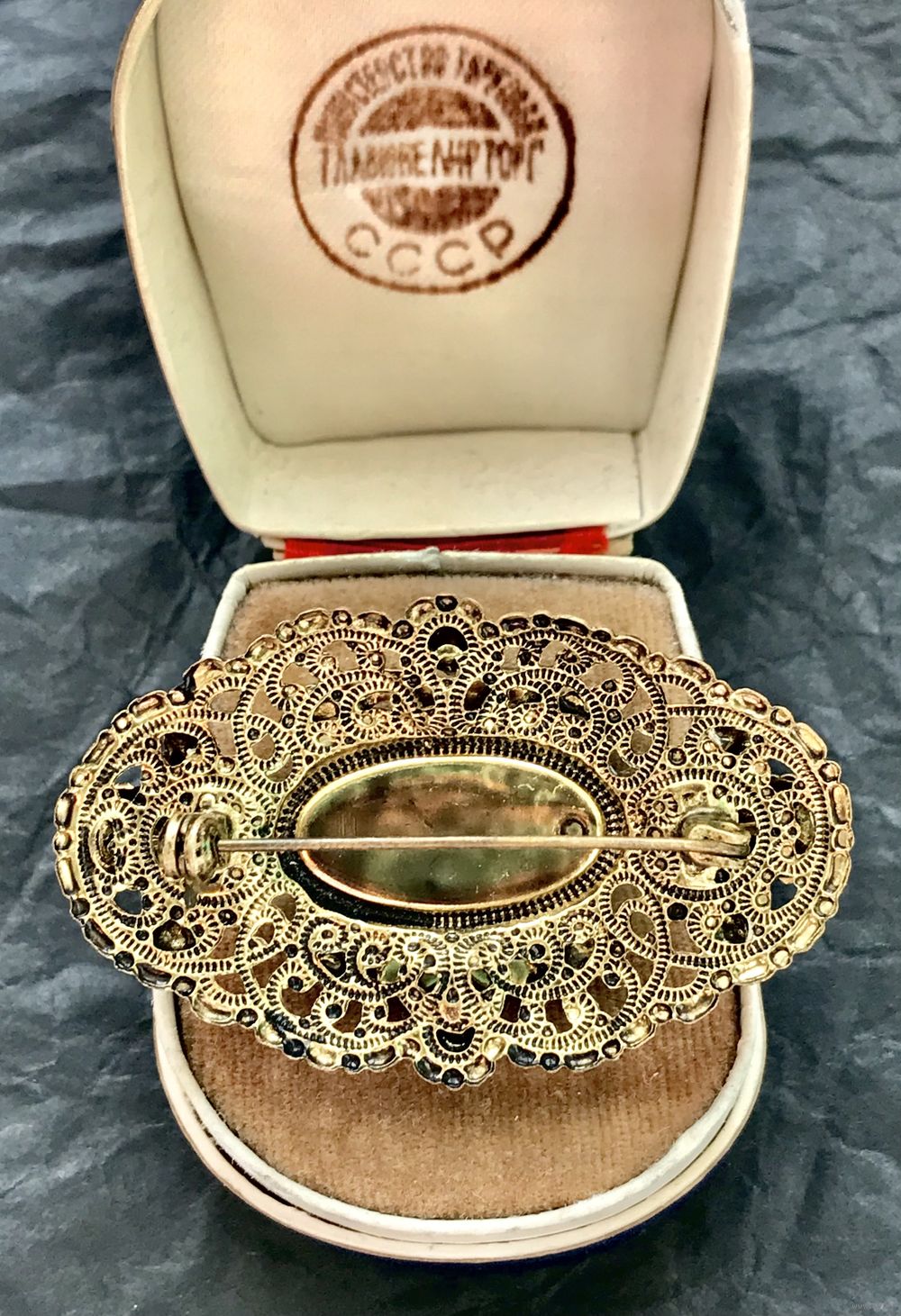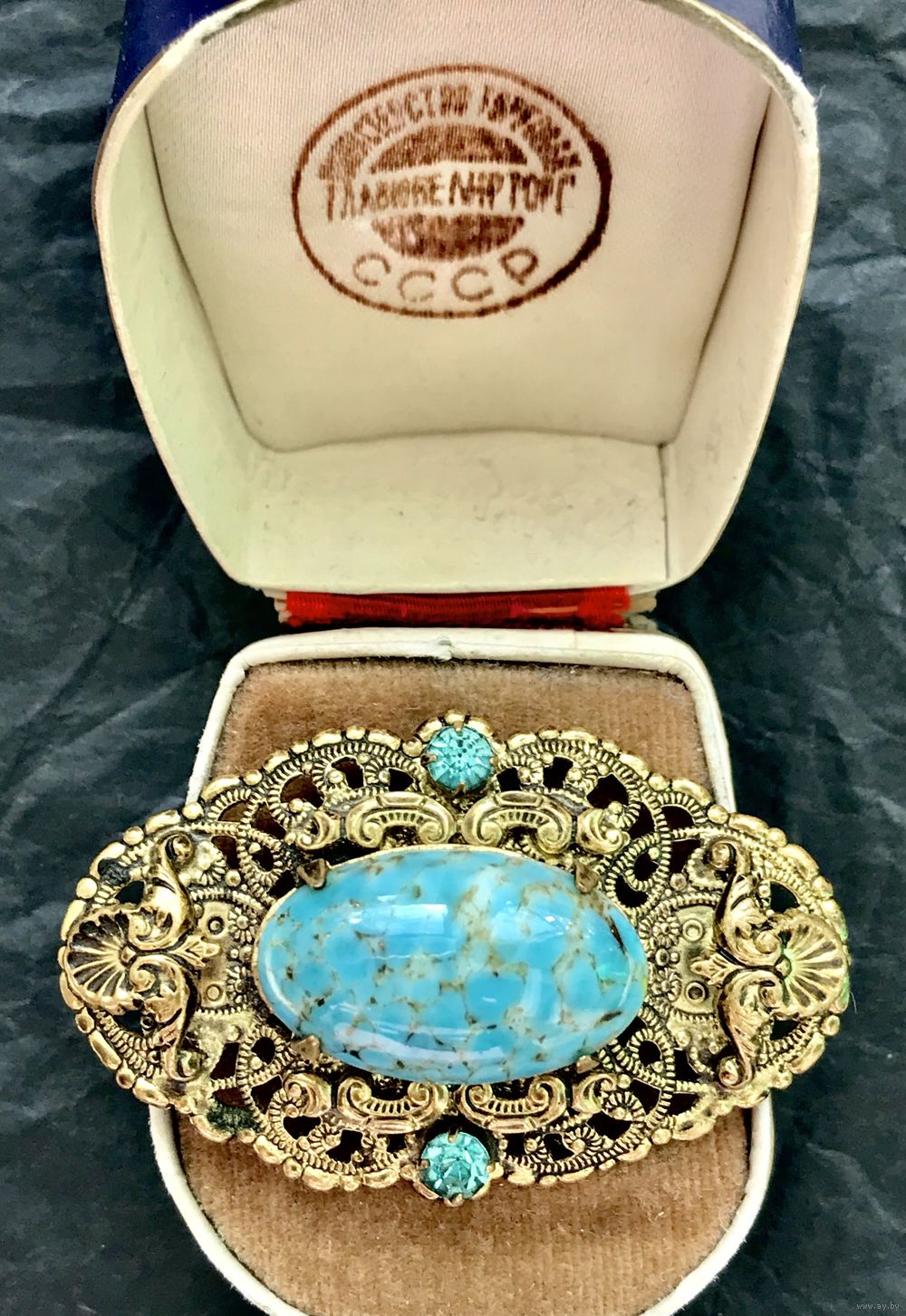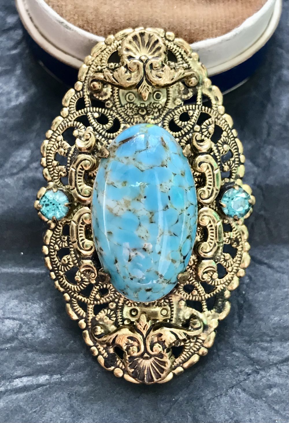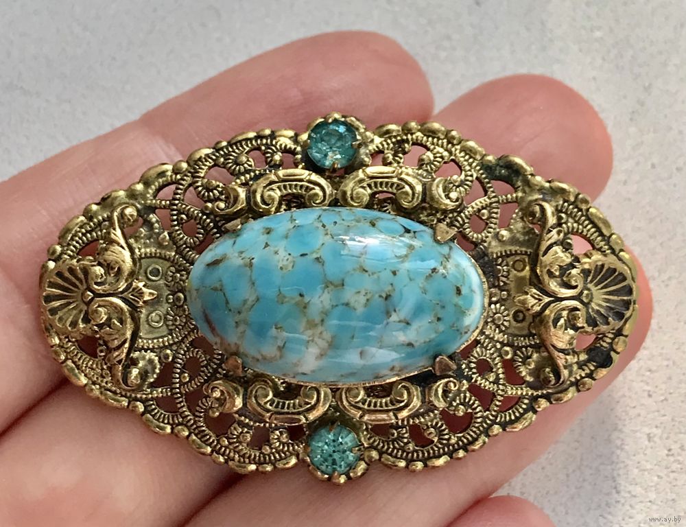 Винтажная чешская брошь с основой из латуни, лицевая сторона украшена крупной вставкой из художественного стекла и кристаллами. Размер броши 5х3см., размер центральной вставки 2,3х1,3см. На металле с лицевой стороны в нескольких местах есть небольшие потемнения. Общее состояние украшения хорошее.