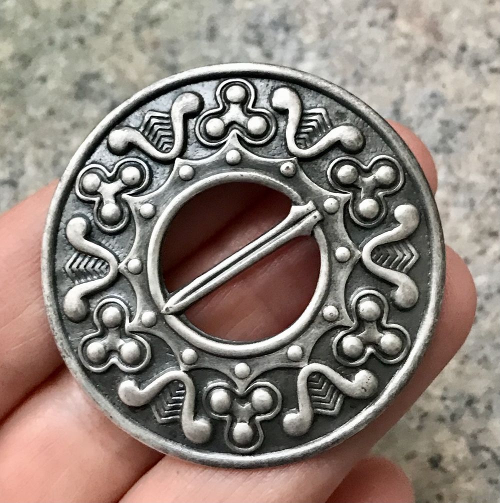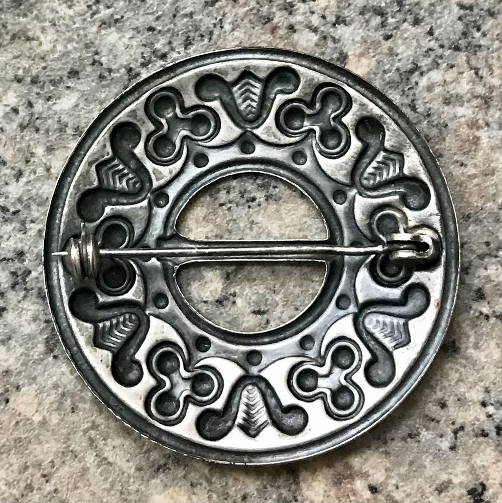 Винтажная брошь фибула (сакта) из мельхиора с серебрением, сделана в Прибалтике в 50-70-х гг. Автор Leida Palu. Диаметр 4,5см. Состояние хорошее.