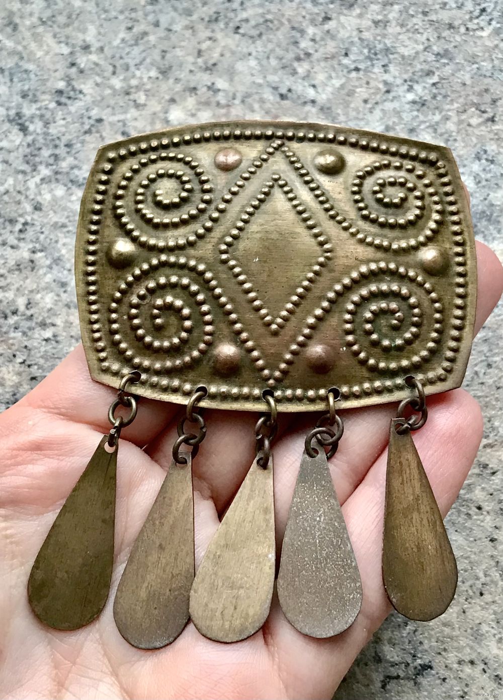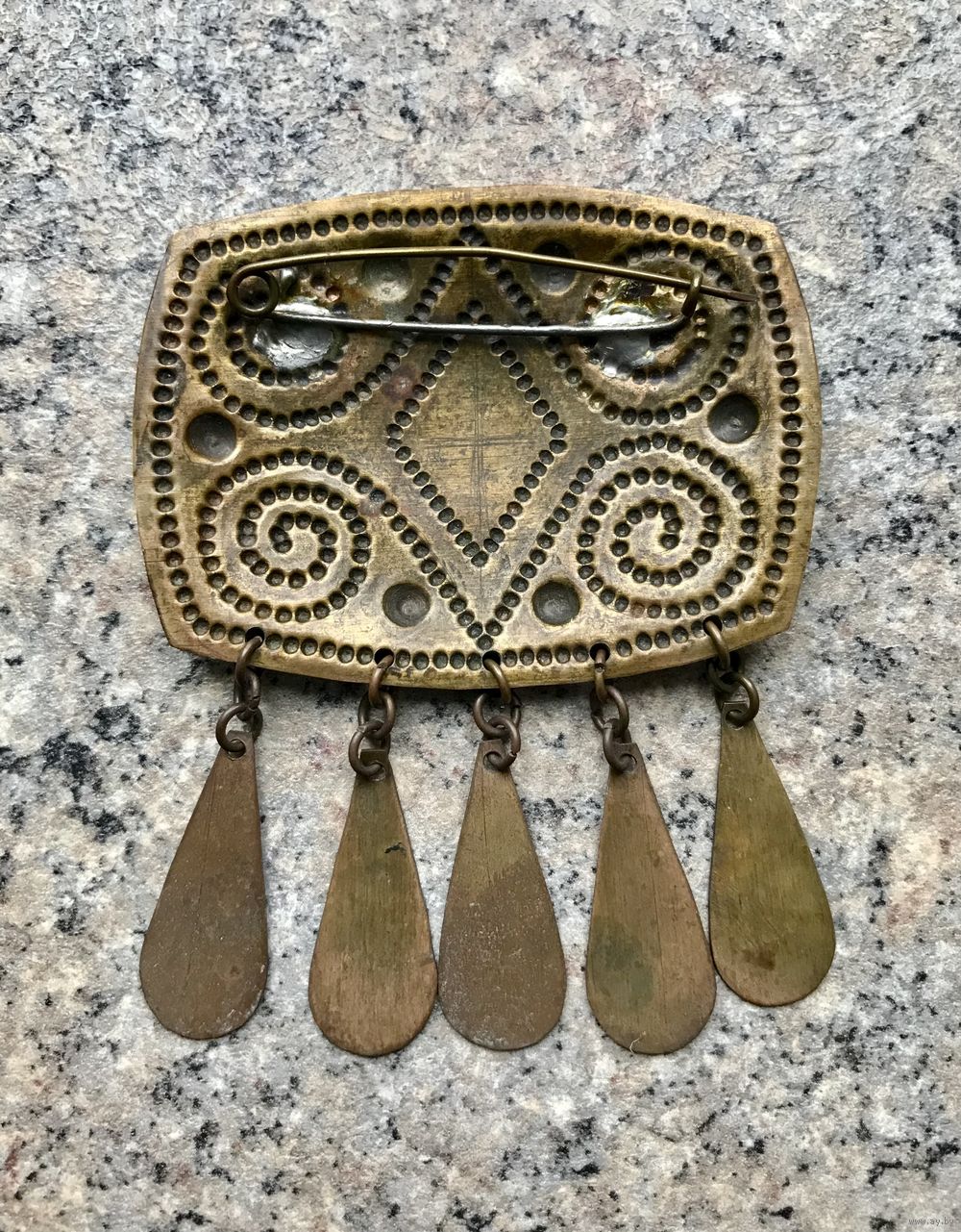 Винтажная брутальная брошь из латуни, Прибалтика 60-70-ее гг. Высота с висюльками 8,5см., ширина 7см. Состояние хорошее.