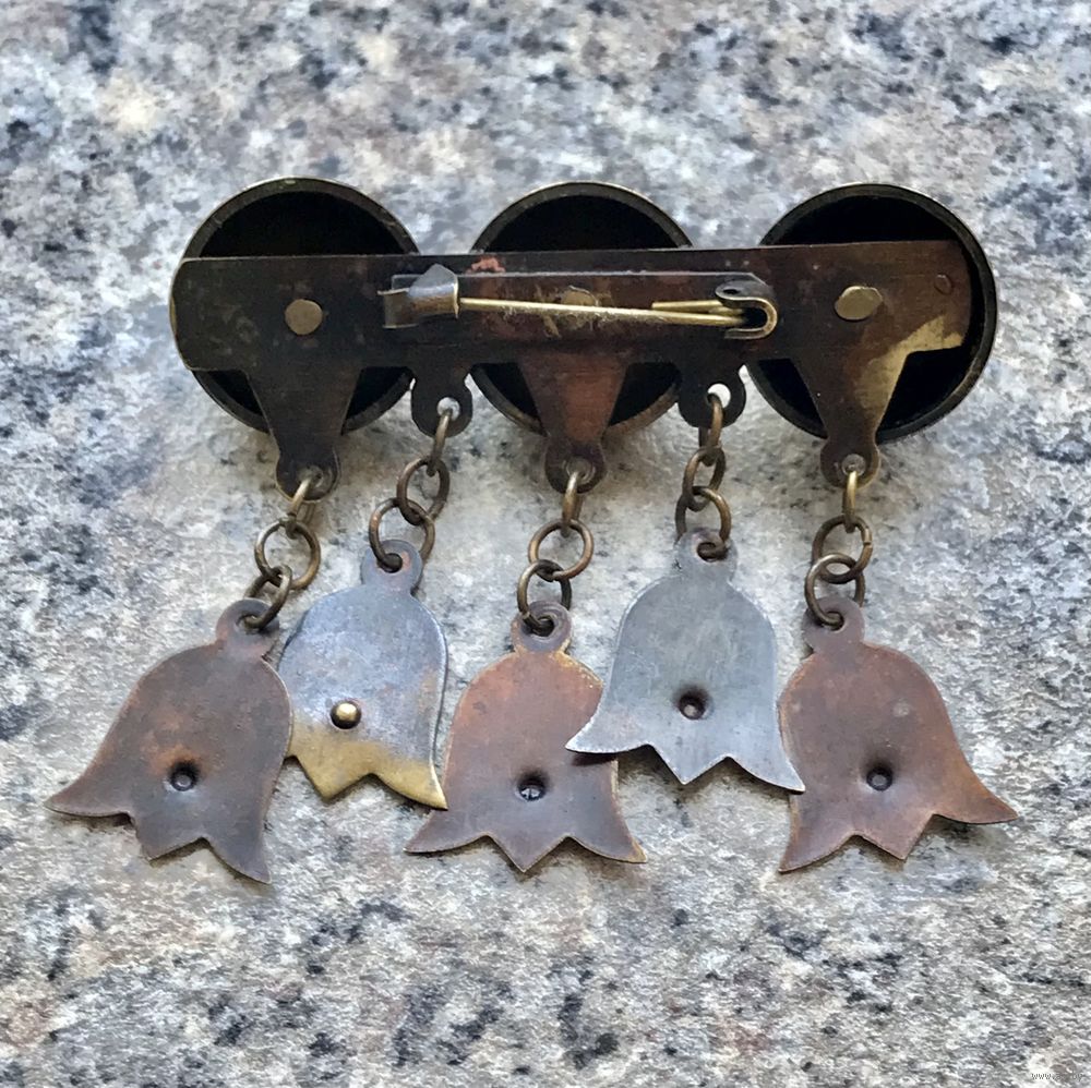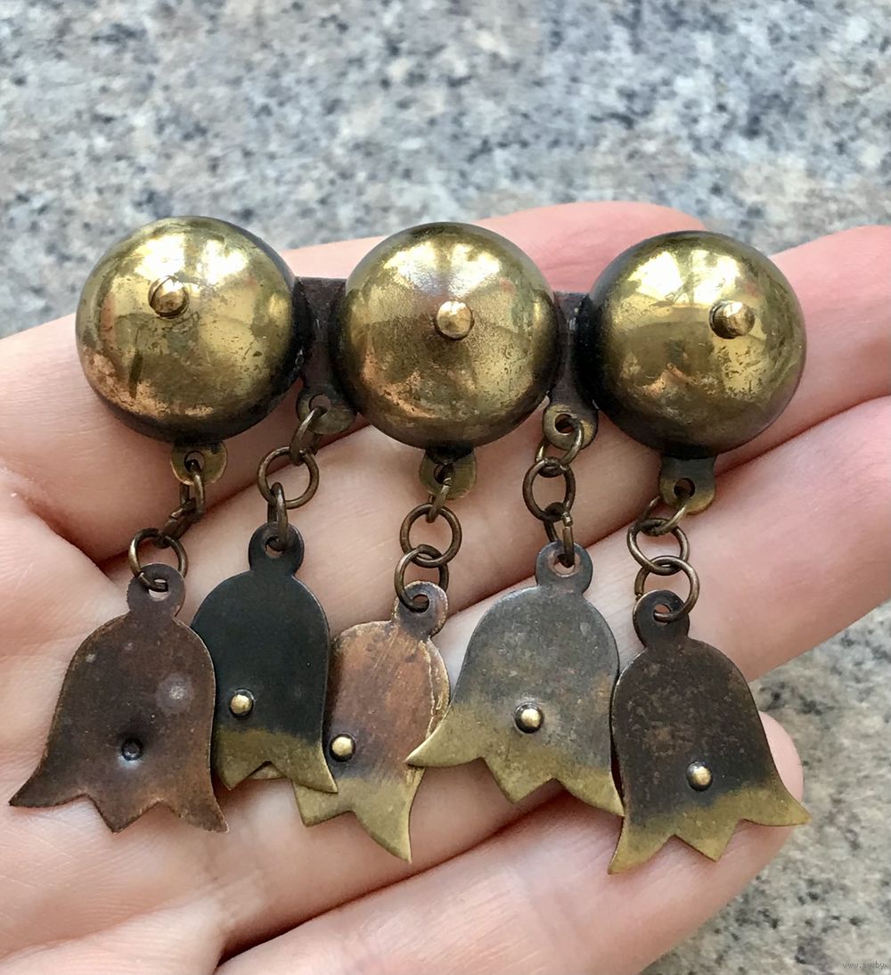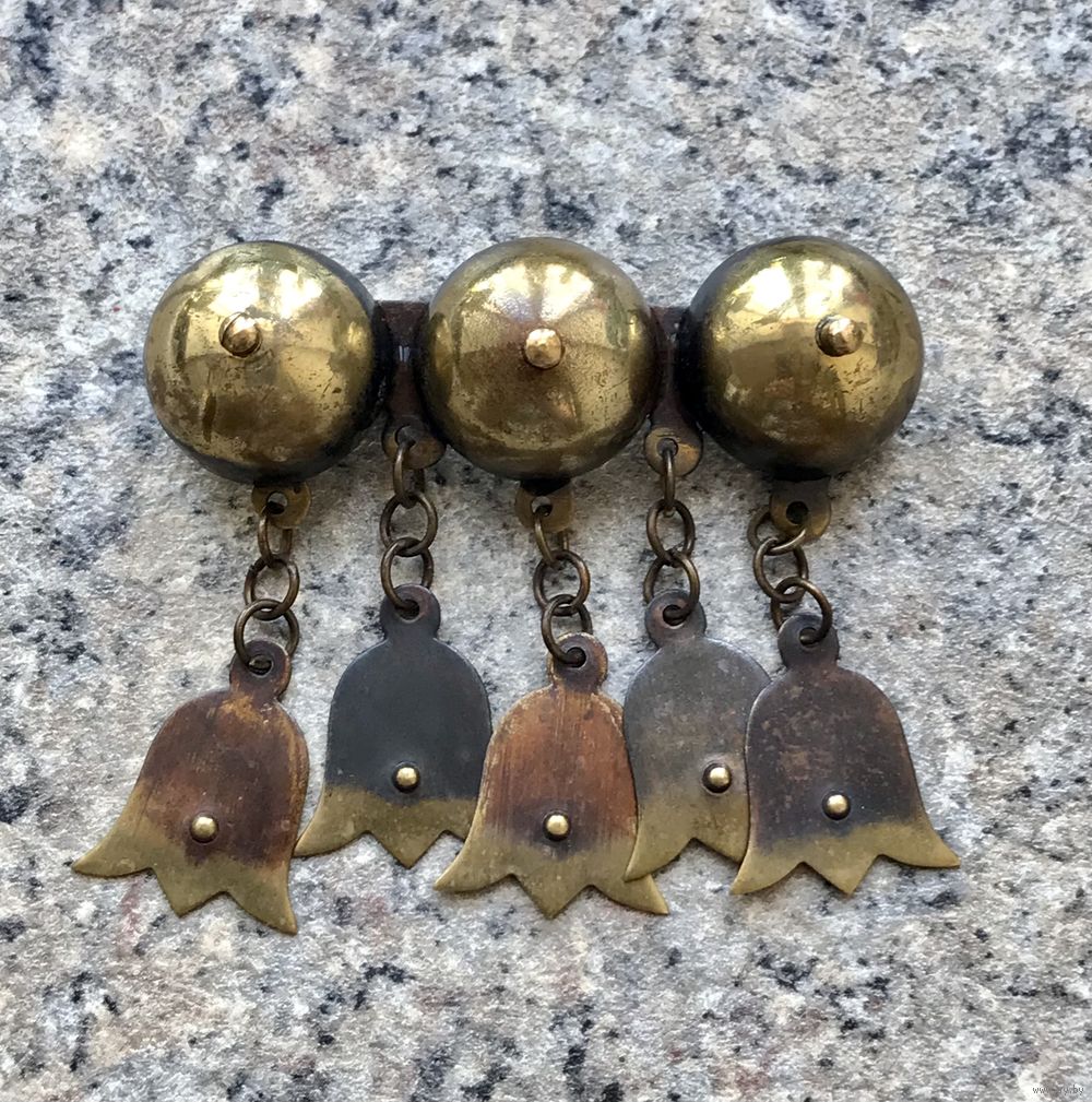 Крупная брошь в этническом стиле из латуни. Редкая модель. Изготовлена в 50-е гг. в Прибалтике. Размер 5,7х5см. Подвески в движении мелодично звенят. Тяжёленькая. Состояние хорошее.