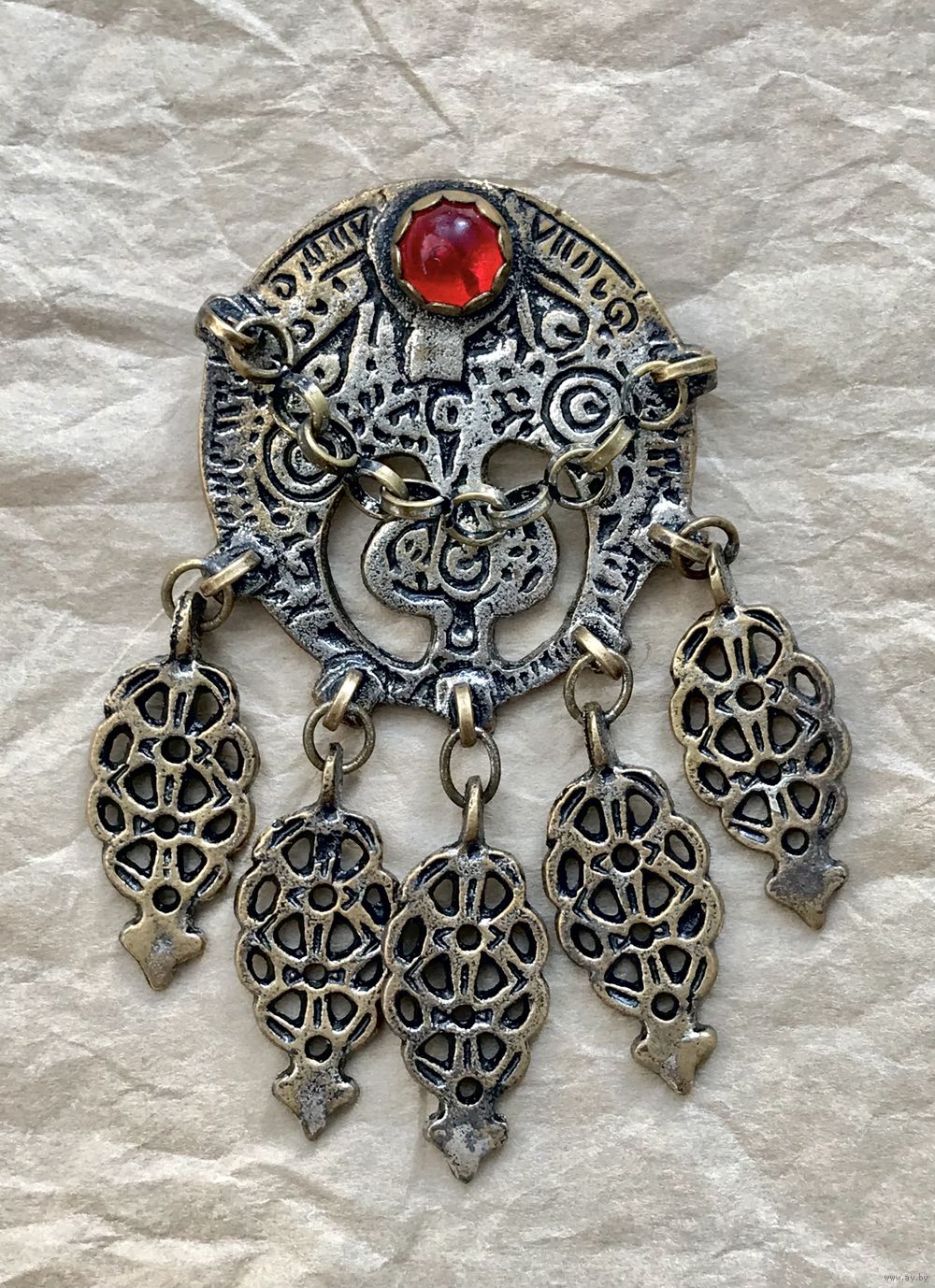 Крупная винтажная брошь в этническом стиле из металла похожего на бронзу с серебристым покрытием.Рубиновая вставка из пластика. Брошь имеет болгарское происхождение. Размер броши 8х4см. На металле имеются потёртости. Тяжёленькая. Состояние хорошее.