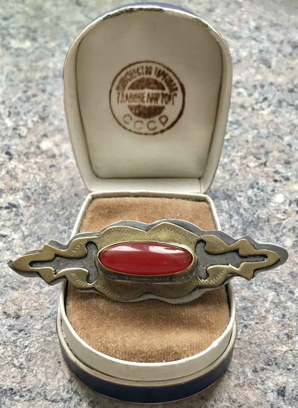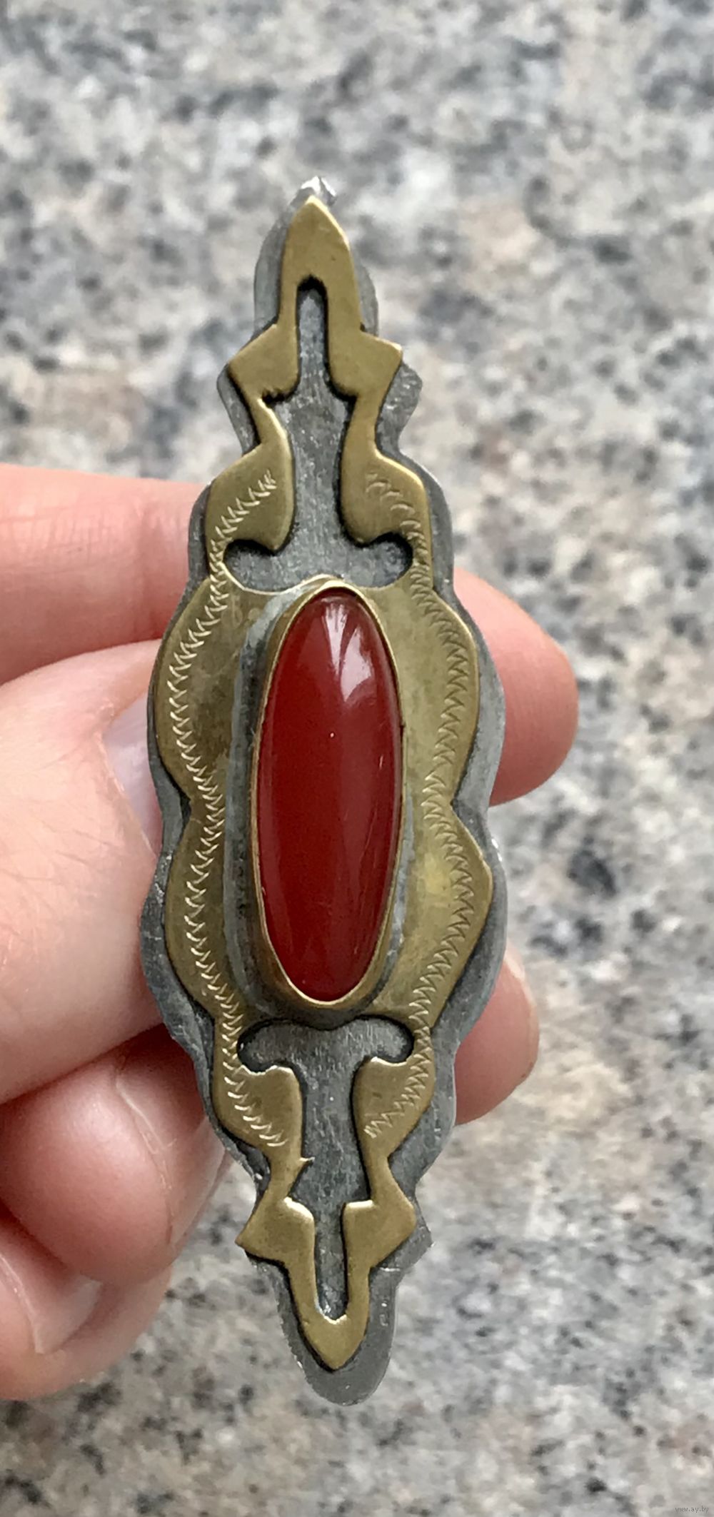 Туркменская брошь с основой из металла и вставкой из плотного пластика под сердолик. Размер 6,5х2см. Состояние хорошее.