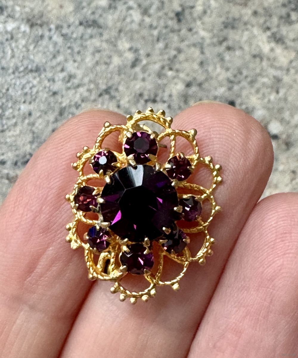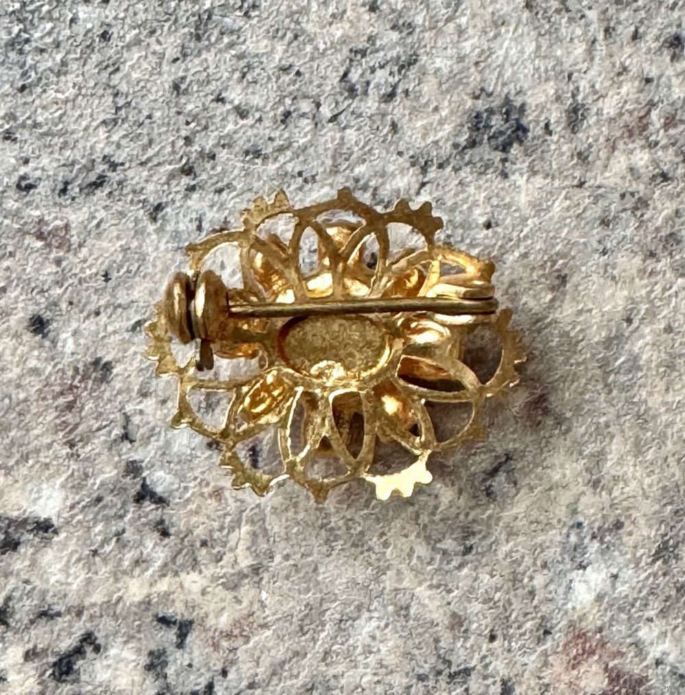 Миниатюрная винтажная брошь. Основа из латуни, на лицевой стороне стекло. Размер 2,3х1,7см. Состояние хорошее.