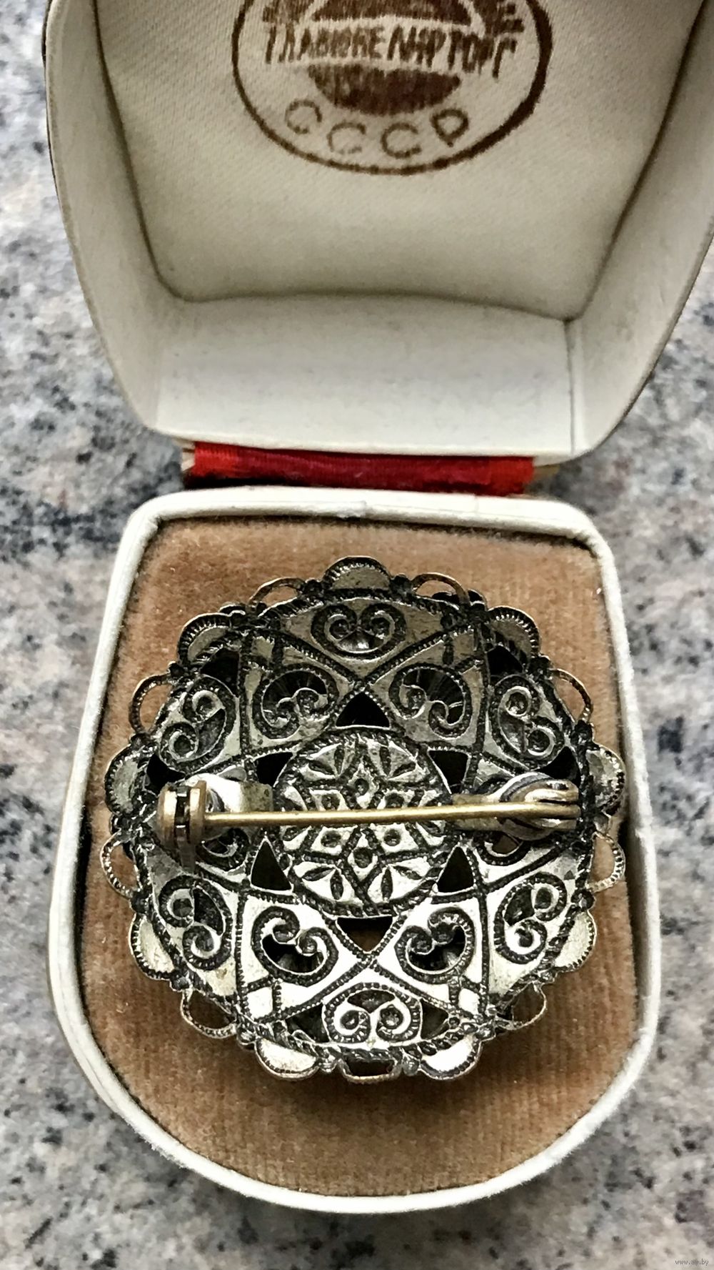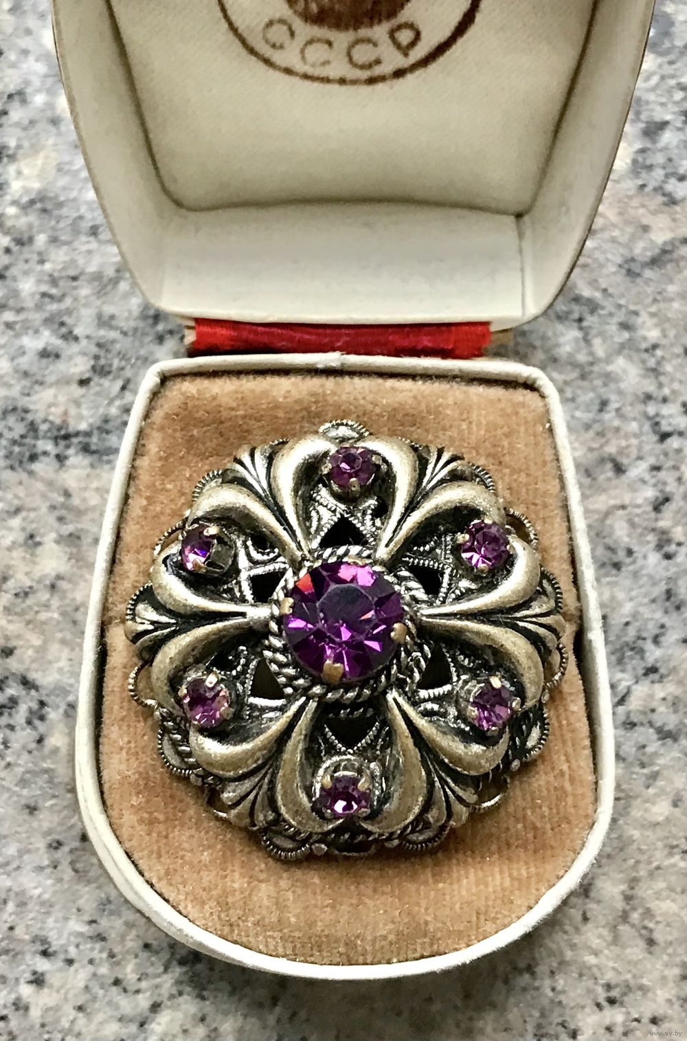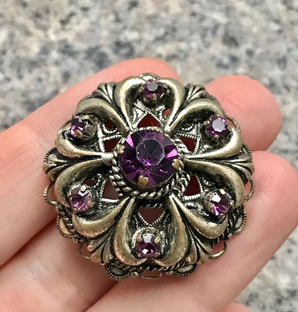 Небольшая винтажная брошь с основой из латуни и вставками из стекла. Диаметр 3,3см. На металле имеются незначительные потёртости, на нескольких вставках небольшие скольчики. Общее состояние хорошее.