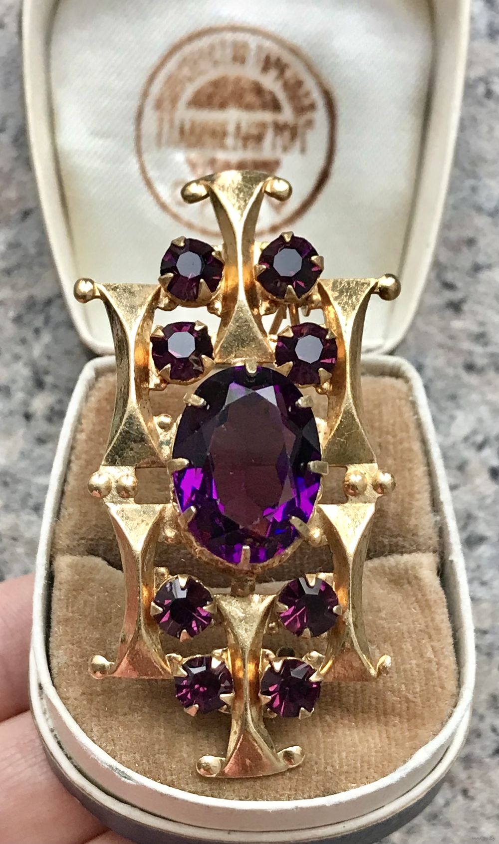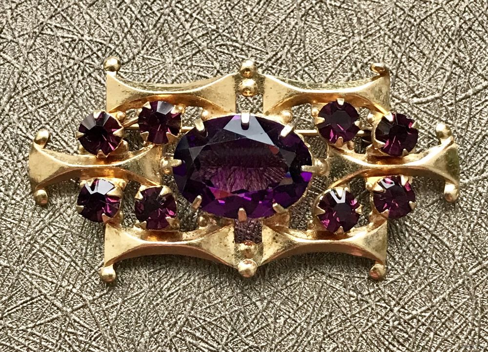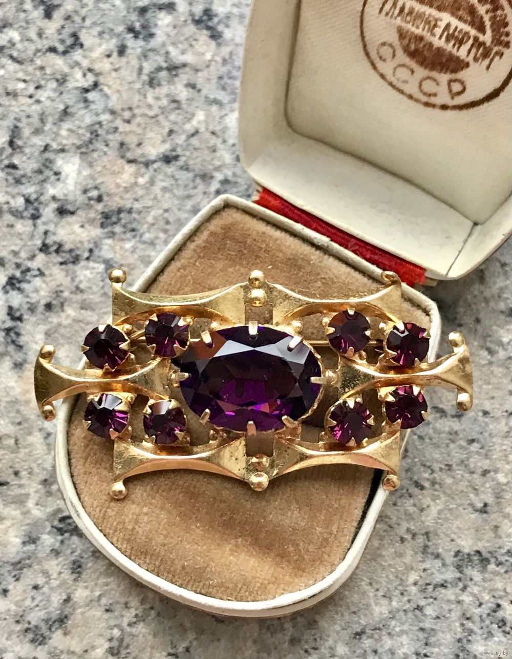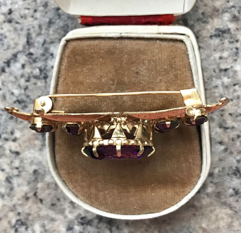 Крупная брошь с основой из латуни с позолотой и вставками из стекла. Изготовлена в Приволжске (70-80-е гг.). Размер броши 5,3х2,5см., размер центральной вставки 1,6х1,2см. На металле в нескольких местах имеются незначительные потемнения, на вставках незначительные скольчики. Общее состояние хорошее. Редкая модель.