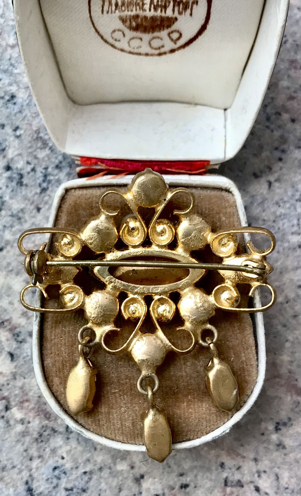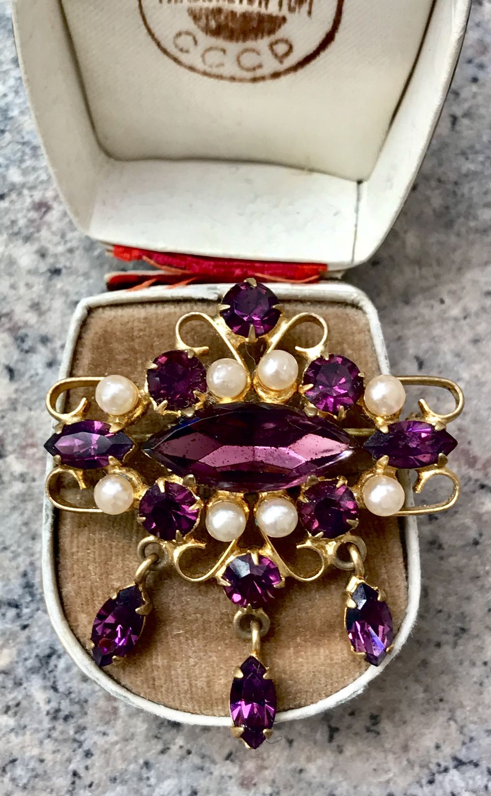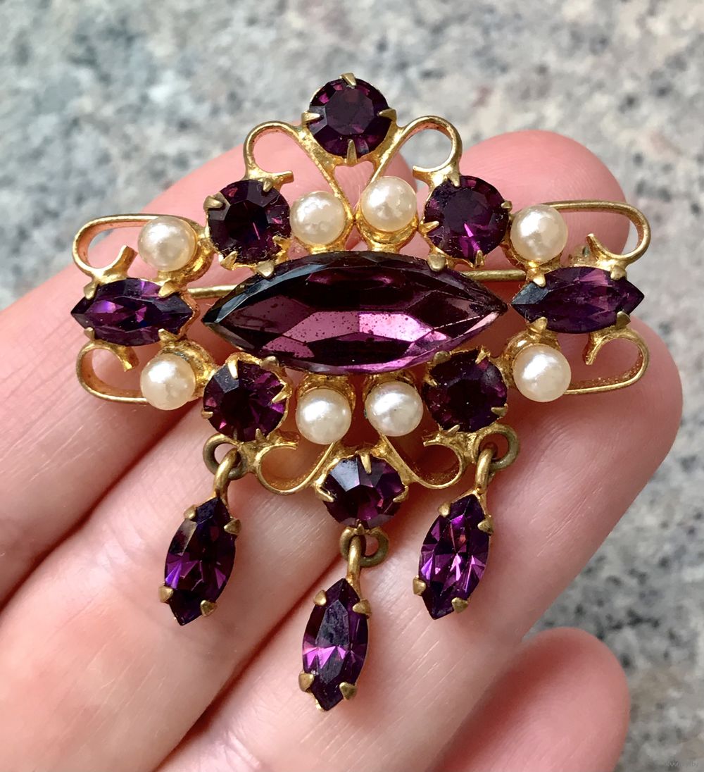 Винтажная брошь с основой из латуни и вставками из стекла и бусин под жемчуг. На жемчужных бусинах местами сход покрытия. Размер броши 5х4,5см. Общее состояние хорошее.