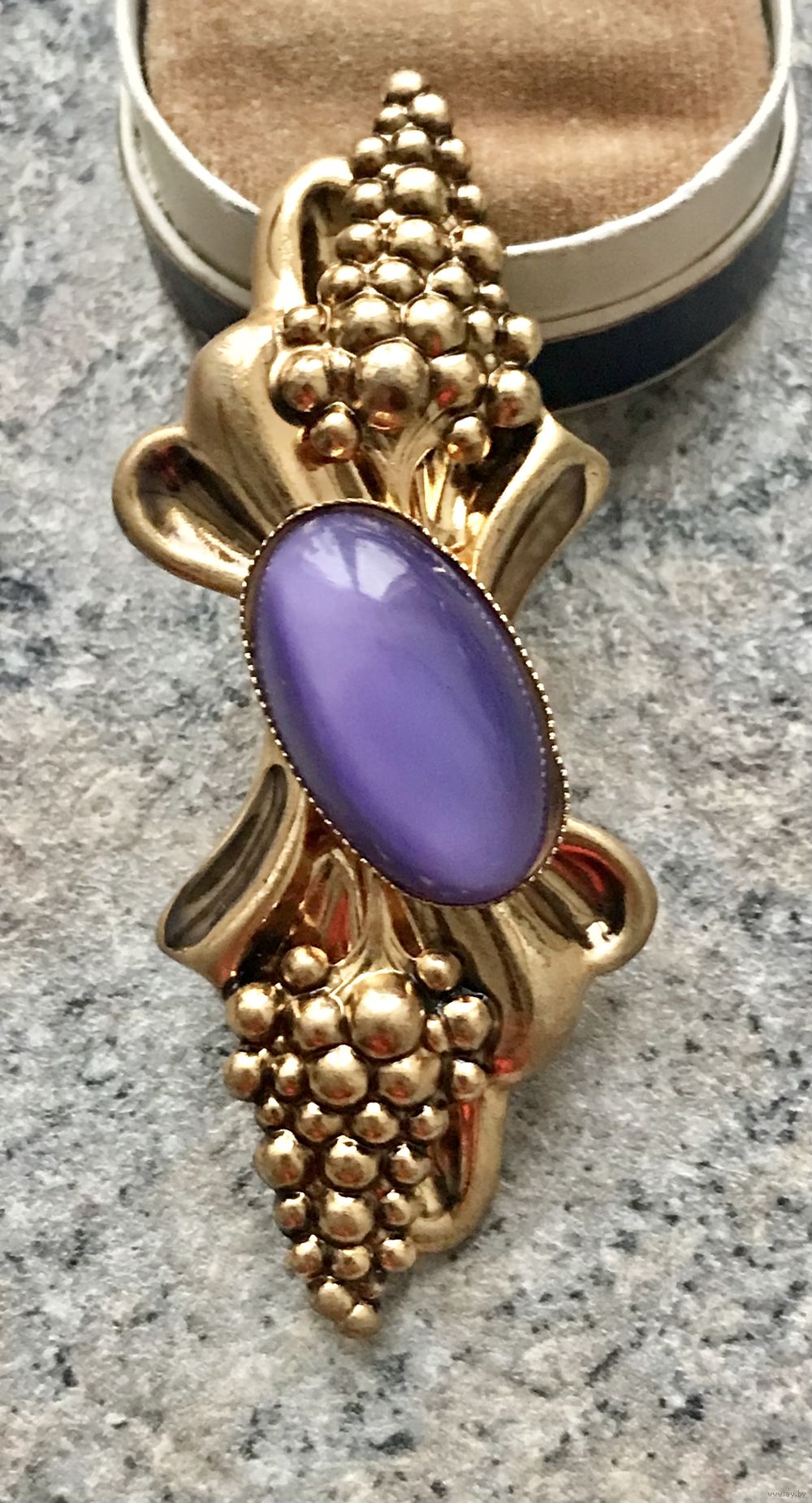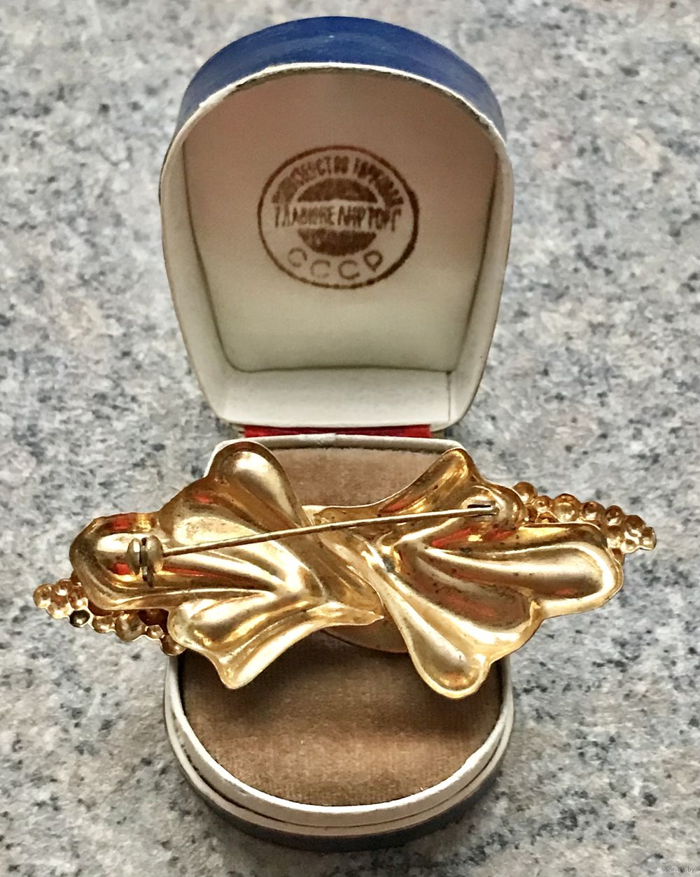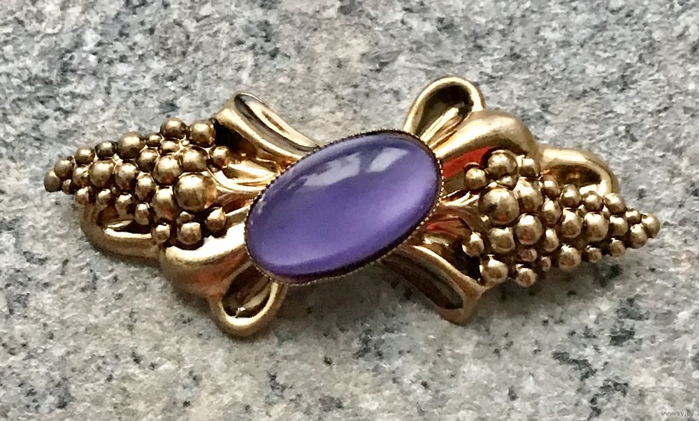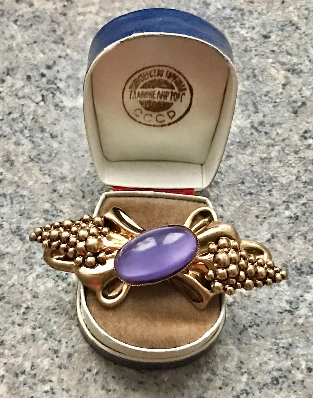 Винтажная крупная брошь с основой из латуни с позолотой и вставкой из стекла. Размер броши 7х3см., размер вставки 2,3х1,3см. Состояние хорошее.