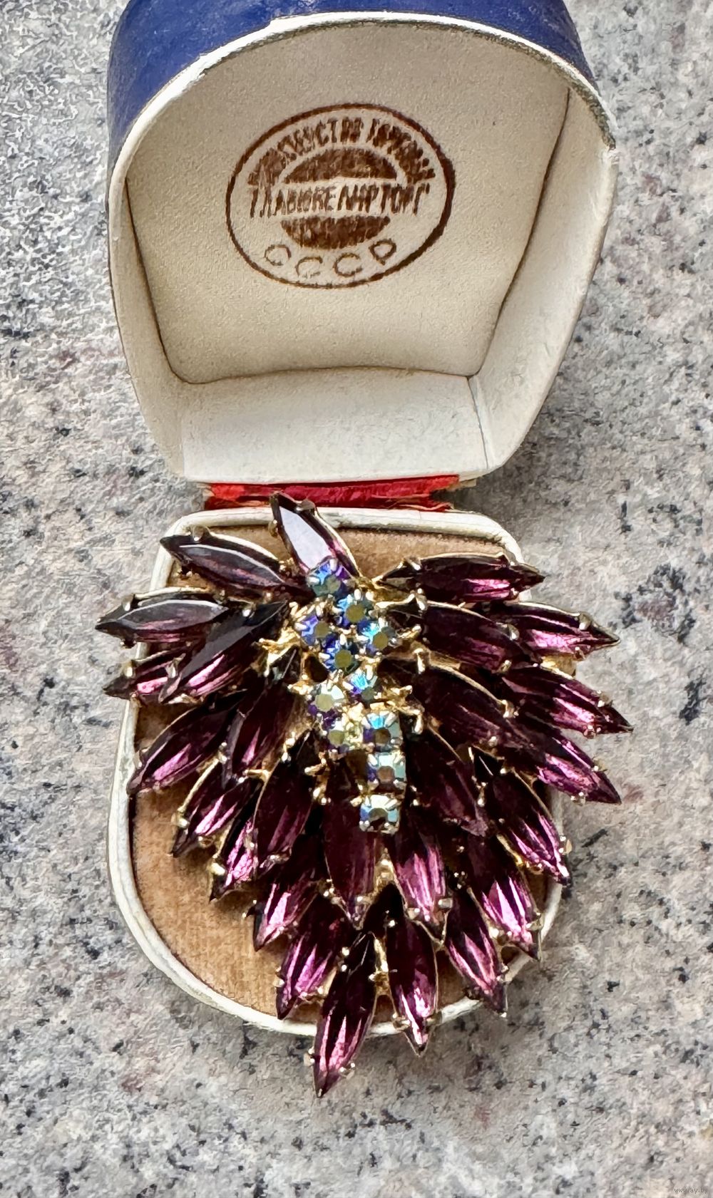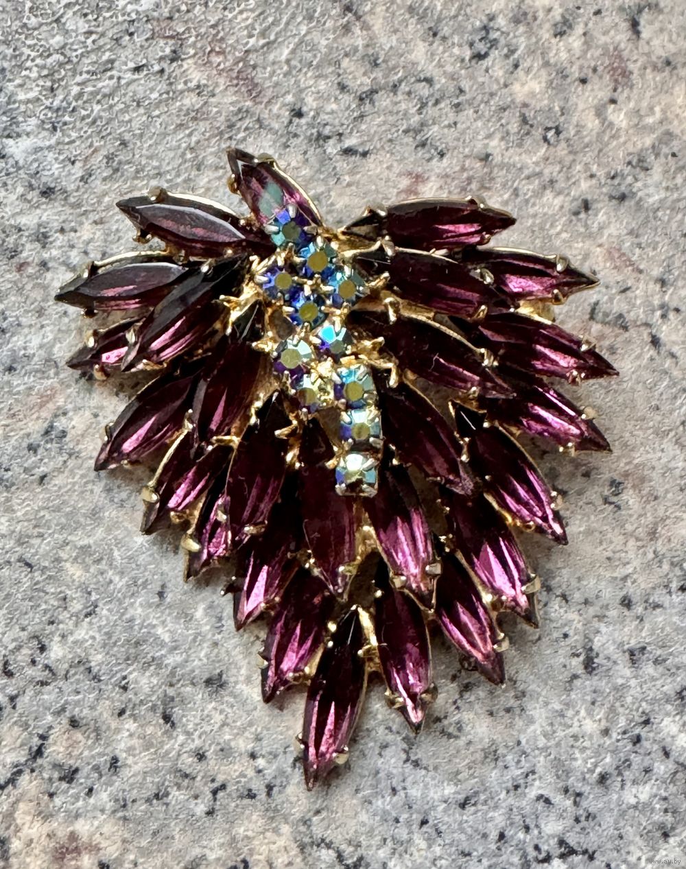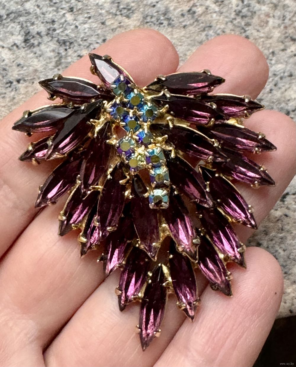 Крупная винтажная чешская брошь с основой из латуни с позолотой, лицевая сторона украшена вставками из цветного стекла и стекла с покрытием AB. Размер броши 5,4х4,7см. На застёжке нет фиксатора (учтено в цене).