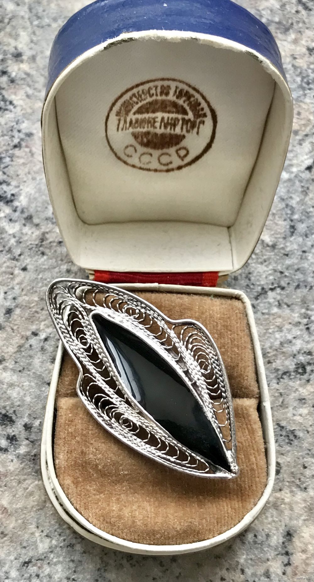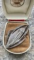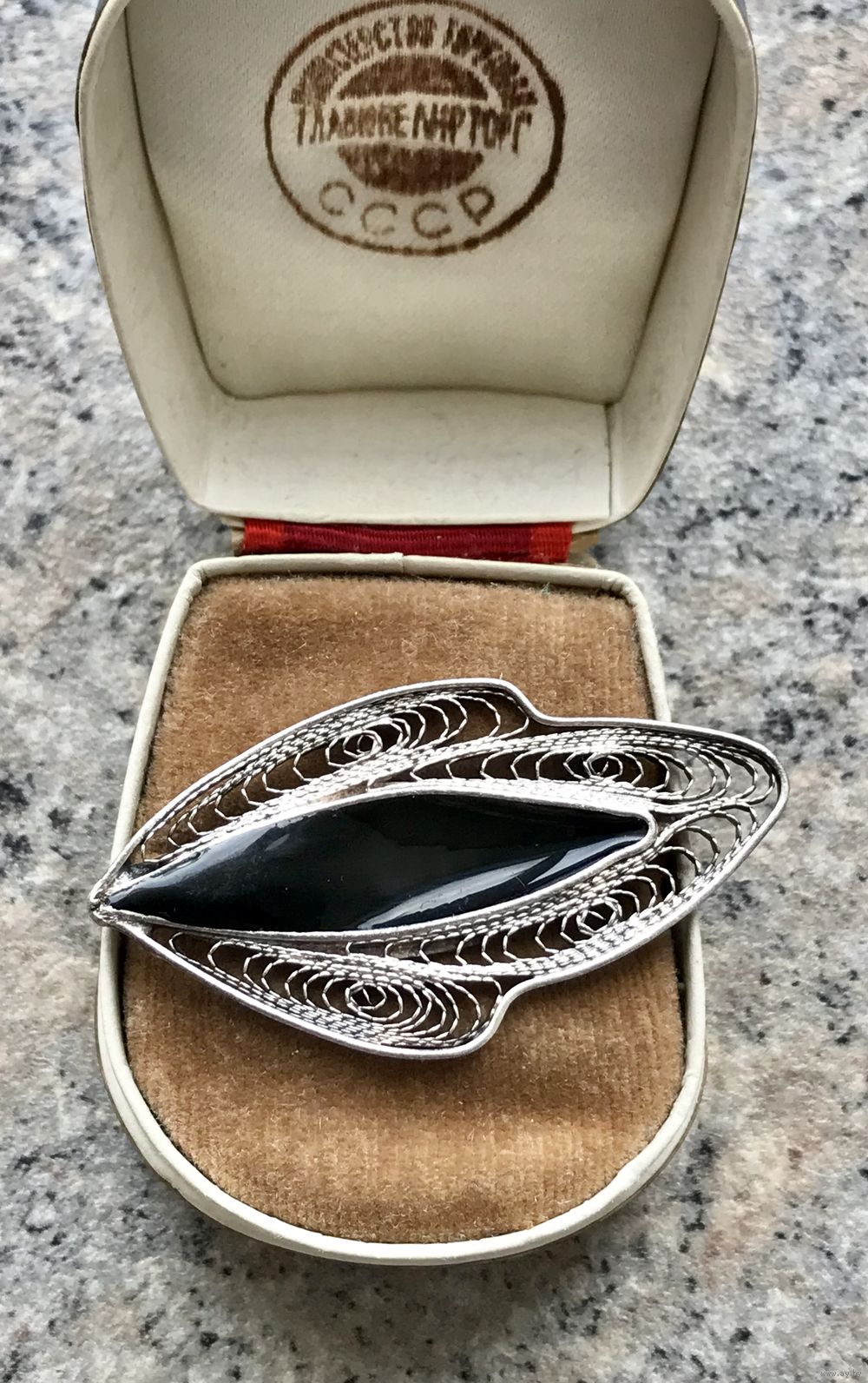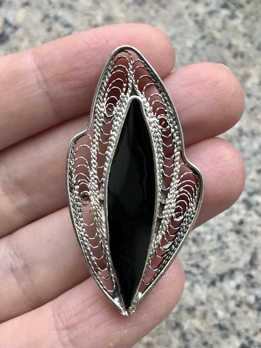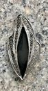 Винтажная брошь из мельхиора, лицевая сторона украшена эмалью чёрного цвета. Размер 4,3х2,5см. Состояние хорошее.