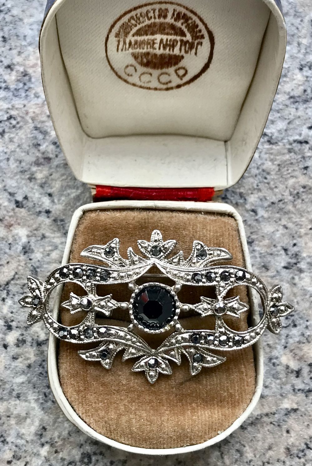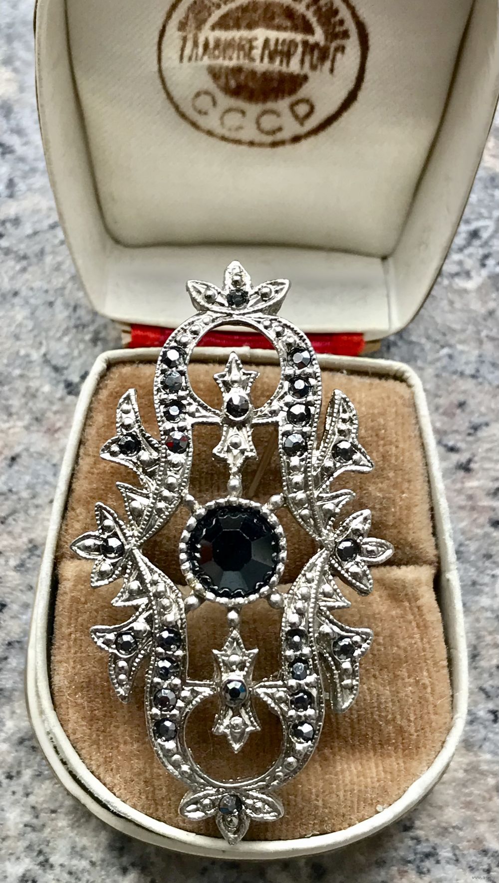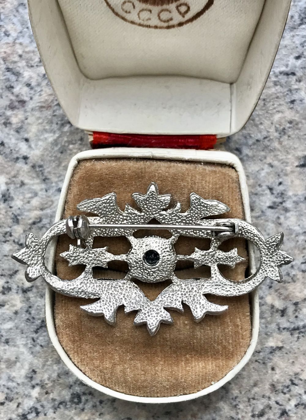 Винтажная брошь с основой из металла серебристого тона, вставки стекло и марказиты. Размер броши 5,2х2,9см. Состояние хорошее.