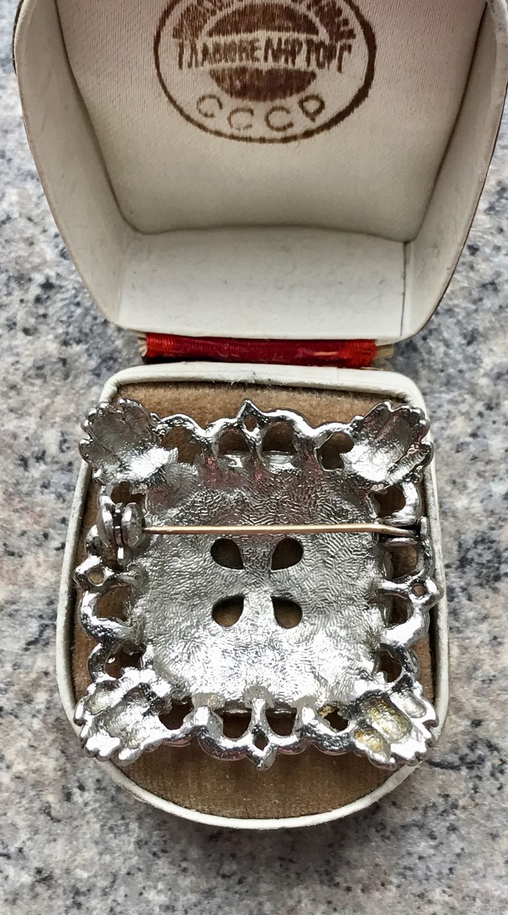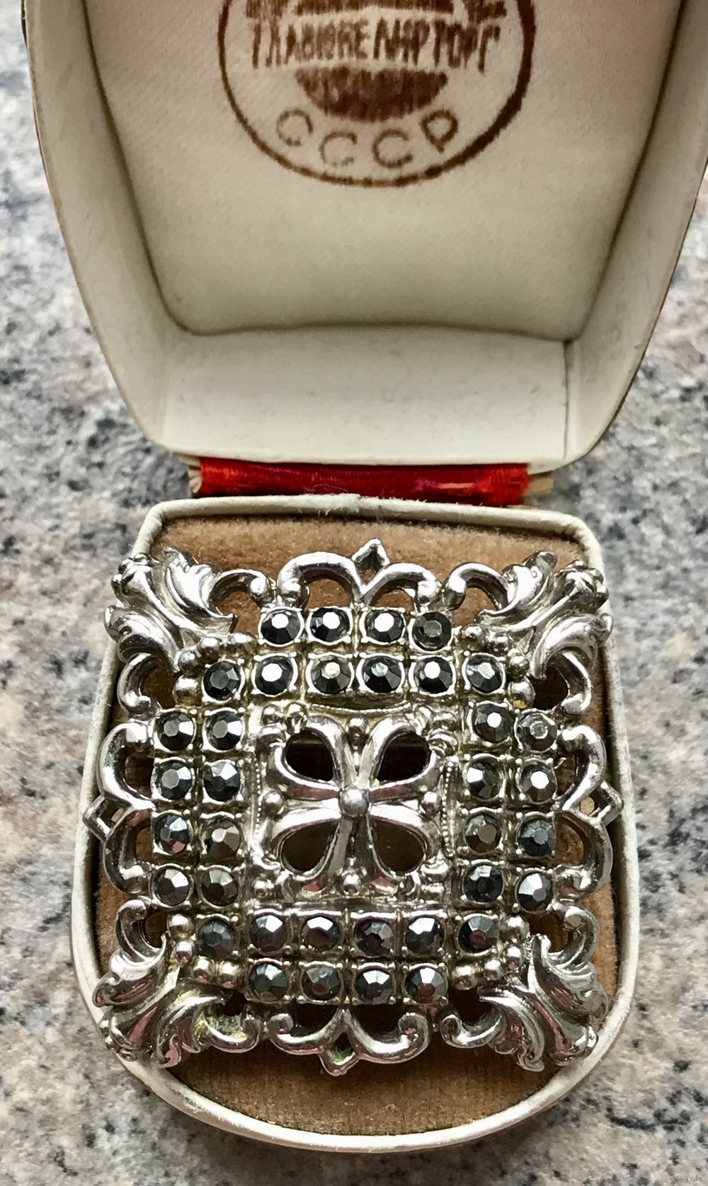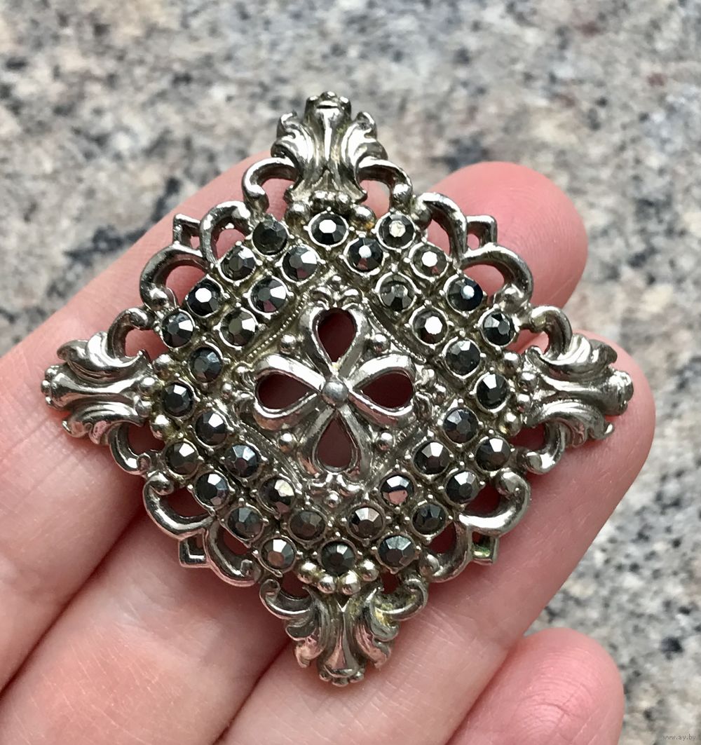 Винтажная брошь с основой из металла серебристого тона и вставками из марказитов. Размер броши 3,5х3,5см. Тяжёленькая. Состояние хорошее.