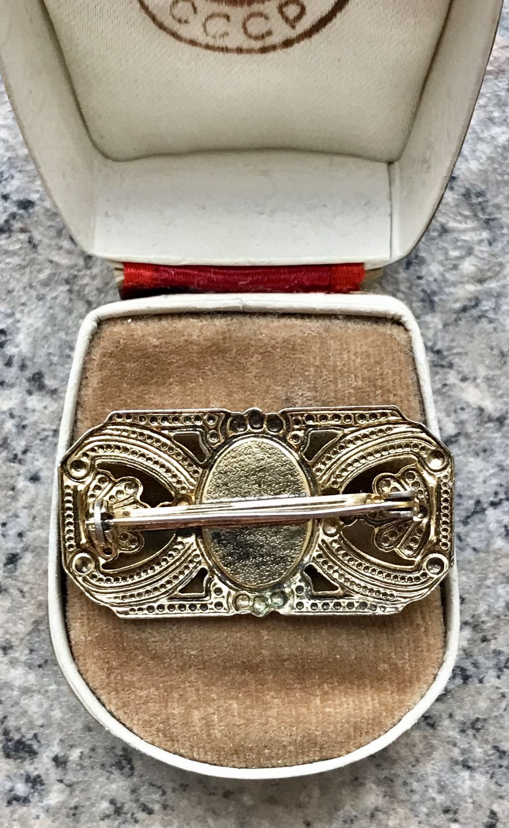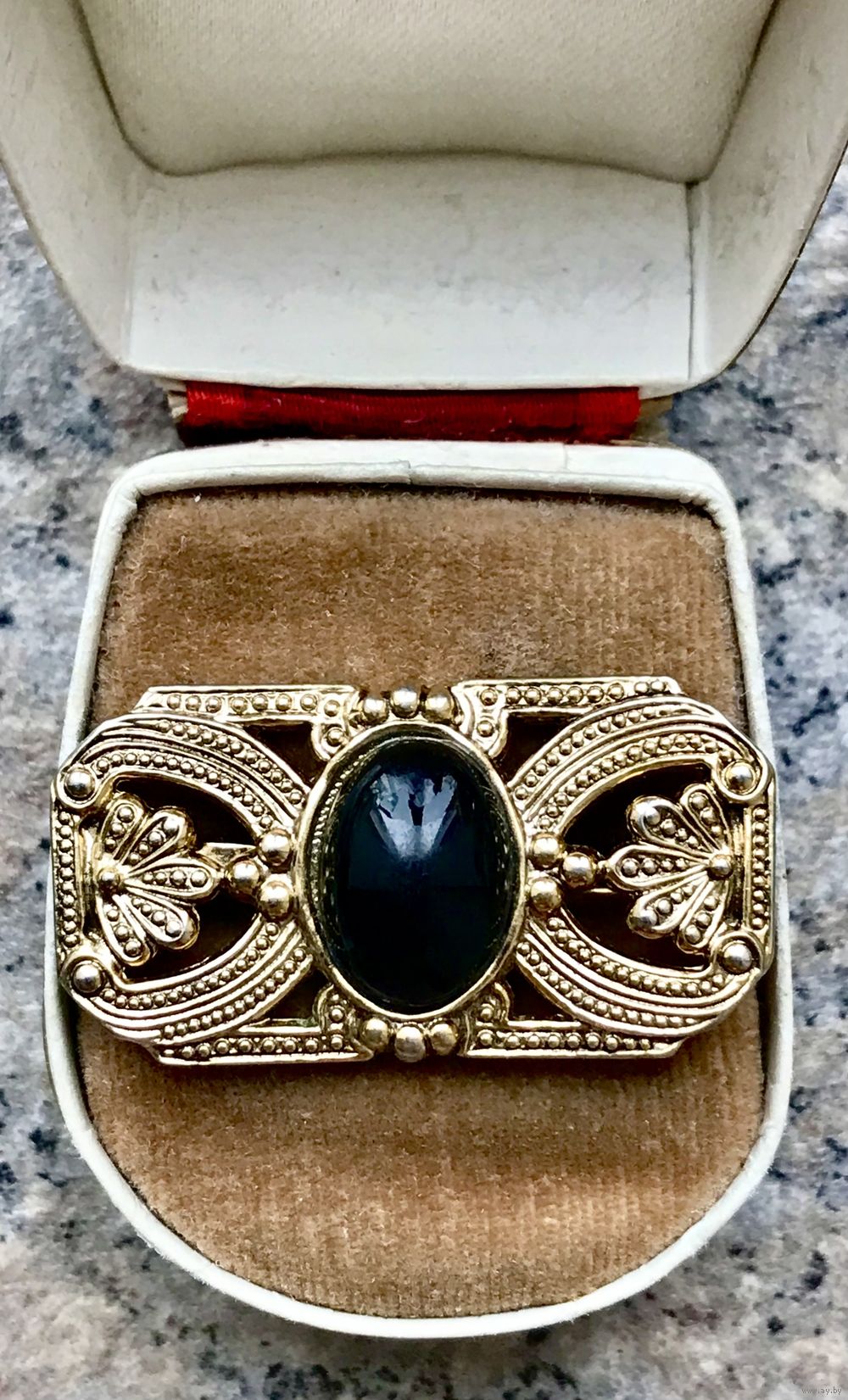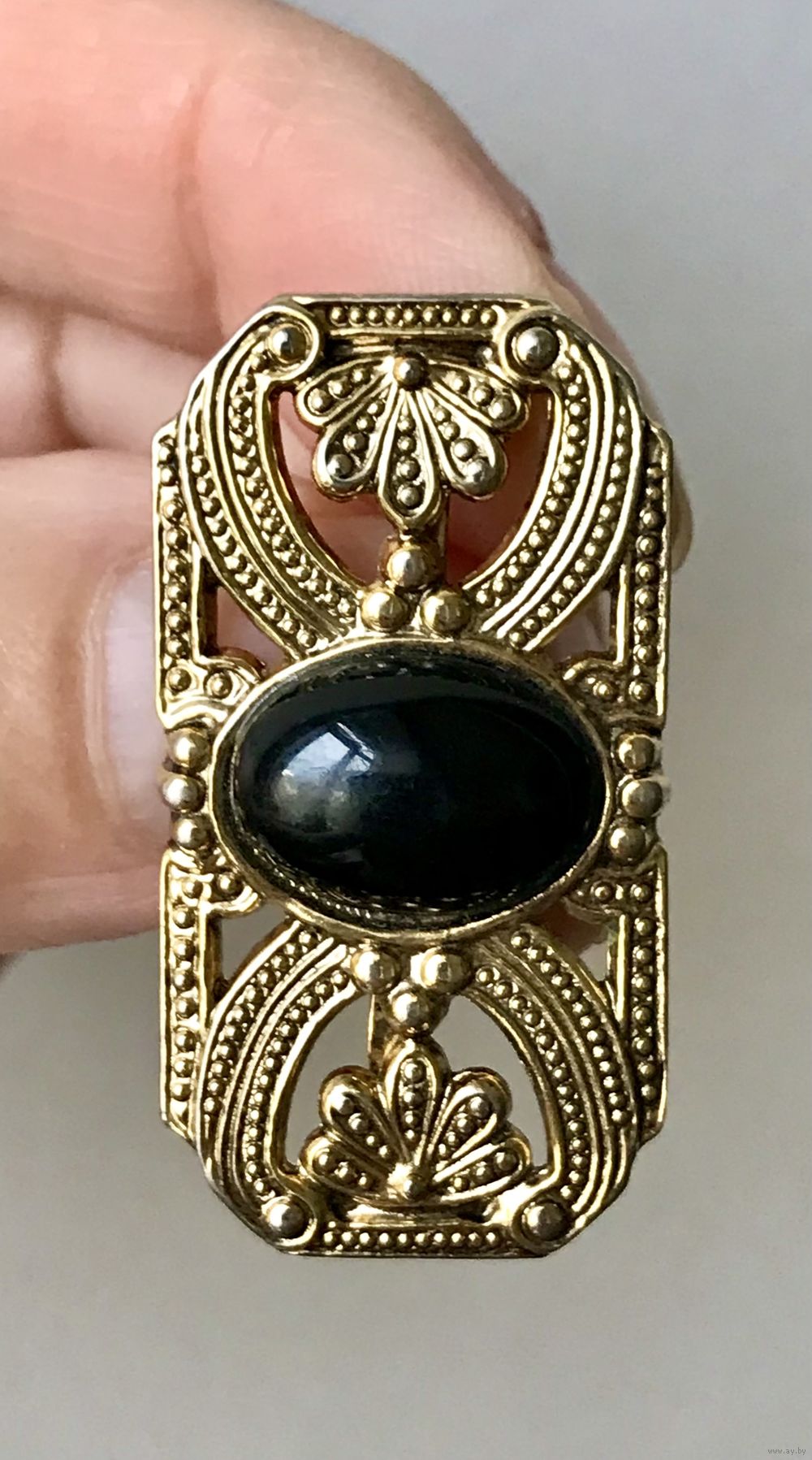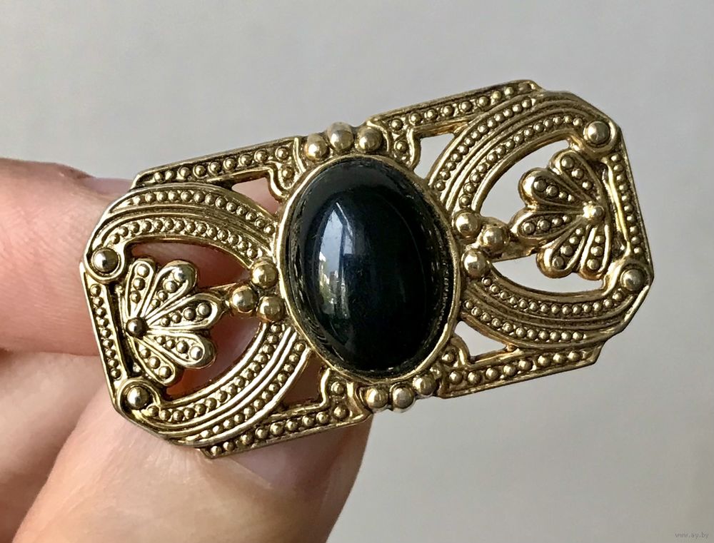Небольшая винтажная брошь с основой из металла золотистого тона, вставка чёрного цвета (плотный пластик). Размер броши 3,3х2см. Состояние хорошее.