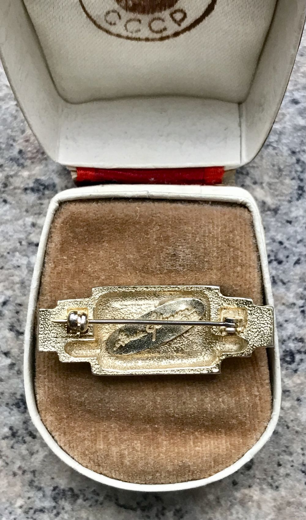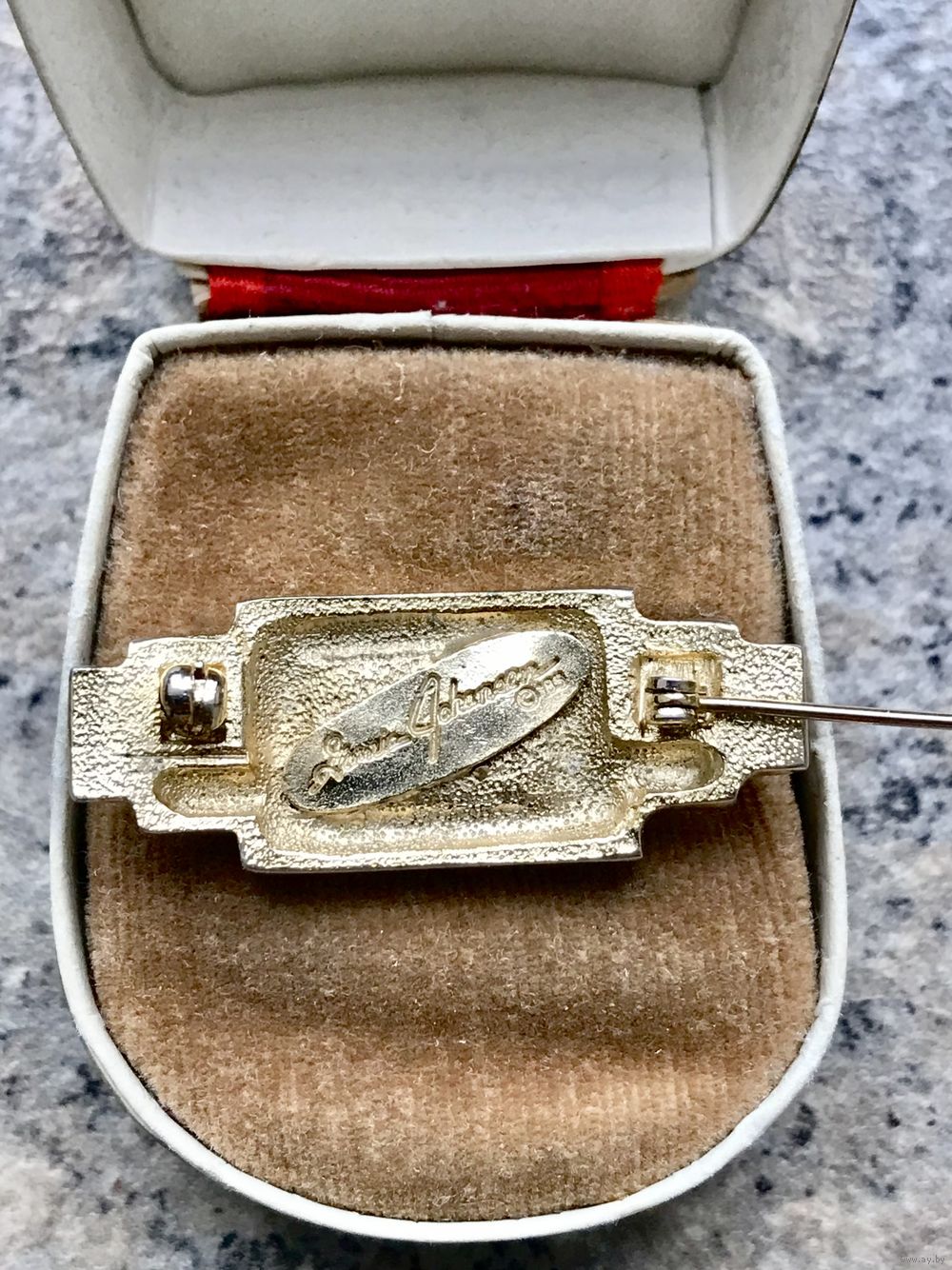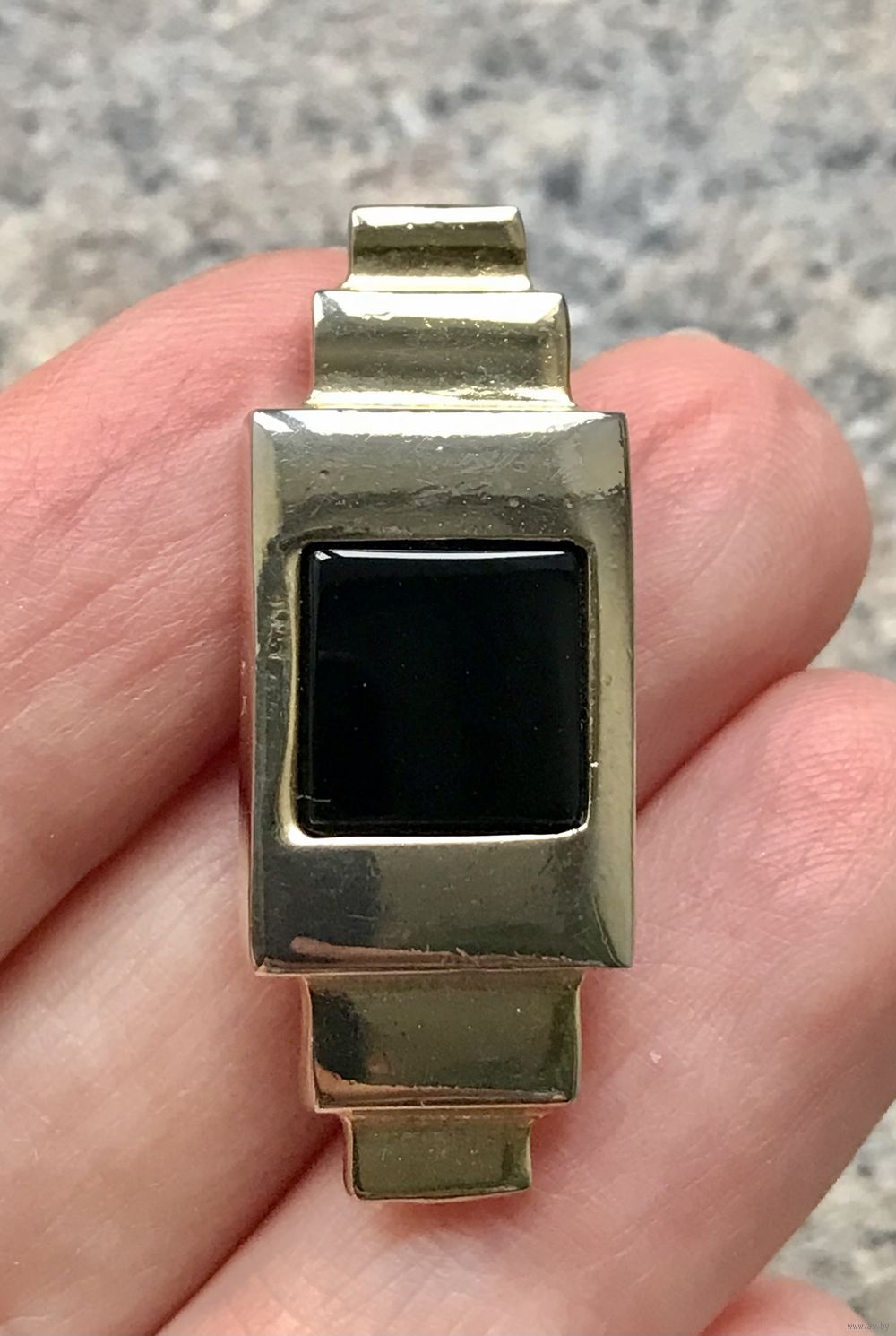 Небольшая винтажная брошь от известного дизайнера платков Ginnie Johansen. Изготовлена из бижутерного сплава золотого тона (на лицевой стороне местами есть незначительные потёртости позолоты), вставка из стекла чёрного цвета. Размер броши 3,6х1,4см. Тяжёленькая. Маркирована.