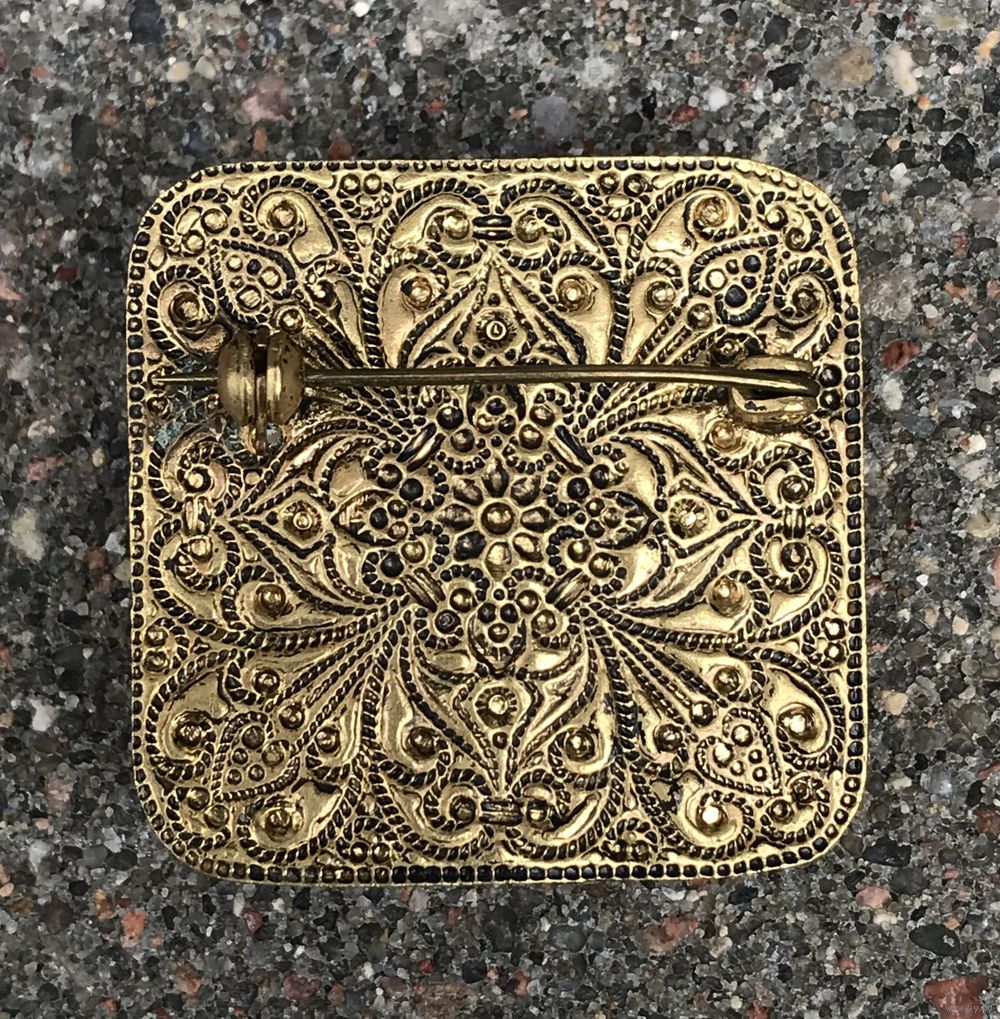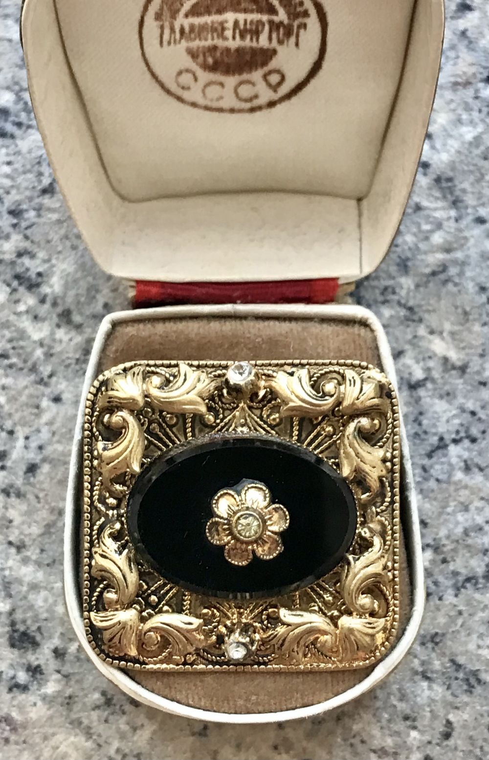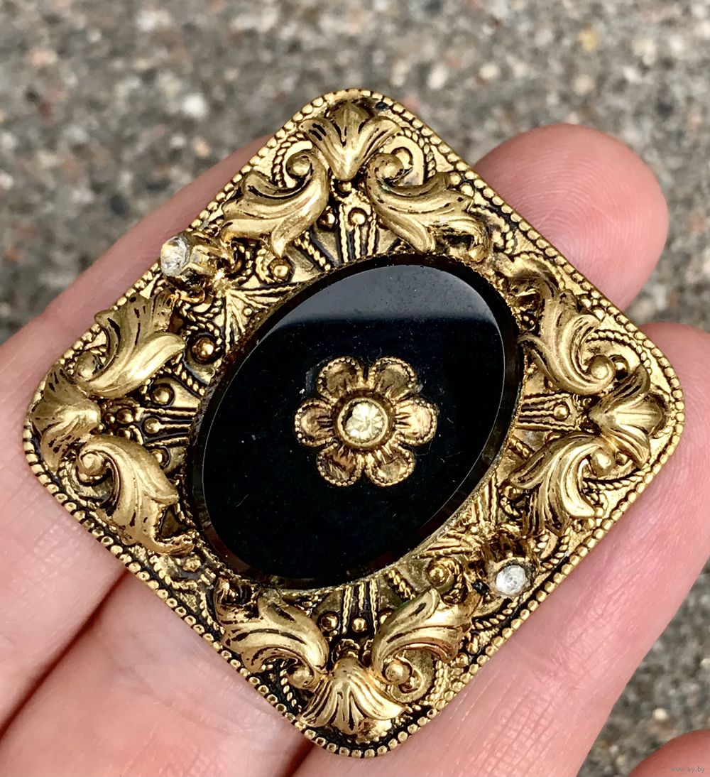 Небольшая винтажная чешская брошь из латуни со вставкой из чёрного стекла и кристаллов. Размер 3,5х3,5см. Состояние хорошее.