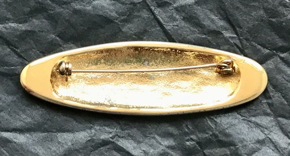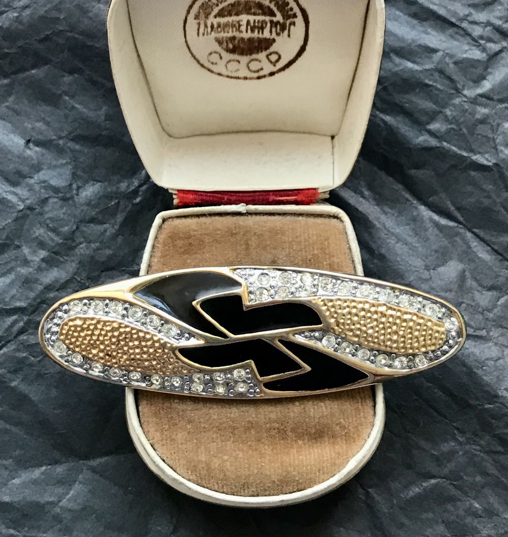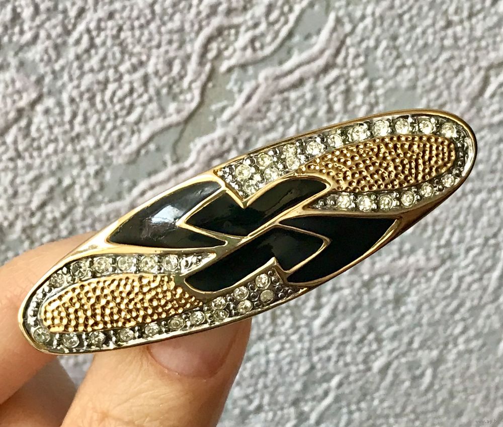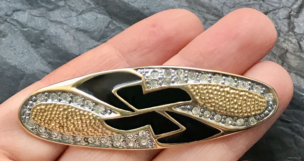 Крупная брошь с основой из металла золотого тона. Лицевая сторона украшена эмалью и кристаллами. Размер броши 6,5х2см. Тяжёленькая. Состояние хорошее.
