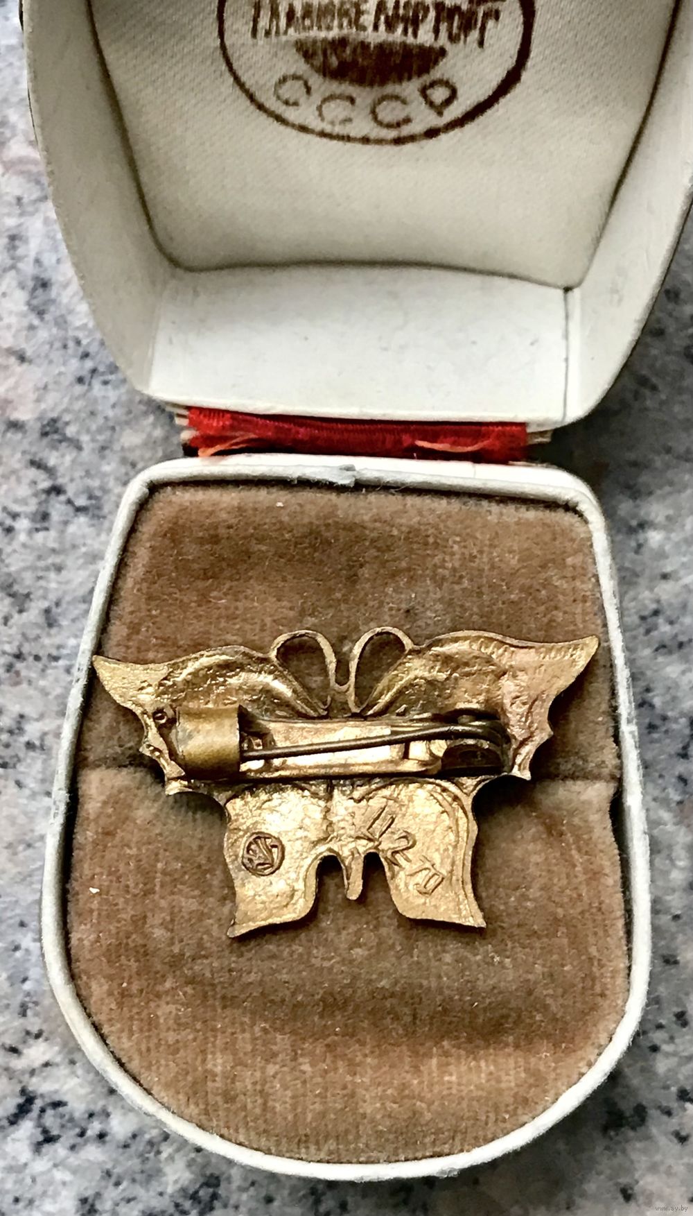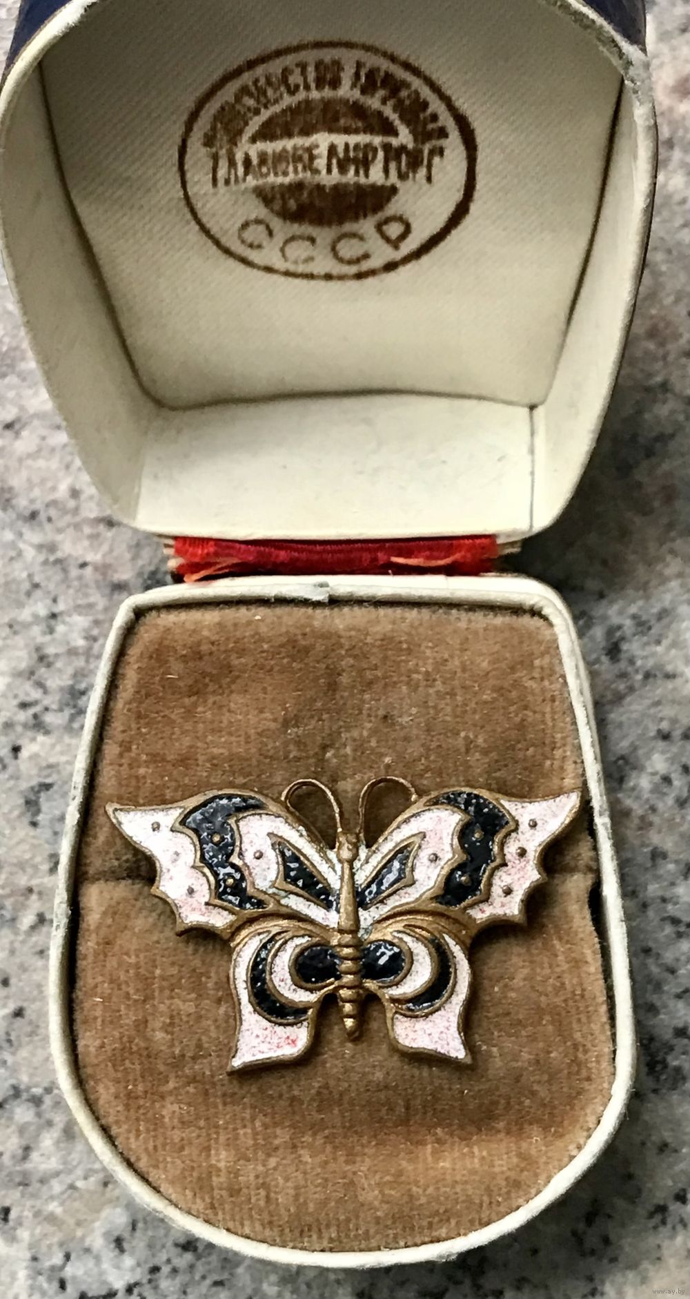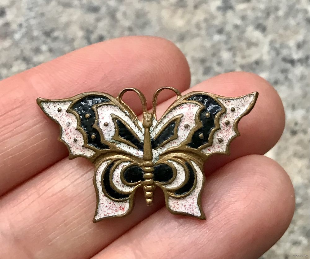 Небольшая брошь в виде бабочки родом из СССР. Лицевая сторона украшена эмалью. Размер 2х3,5см. На обратной стороне стоит клеймо, атрибутировать не удалось. Состояние хорошее.