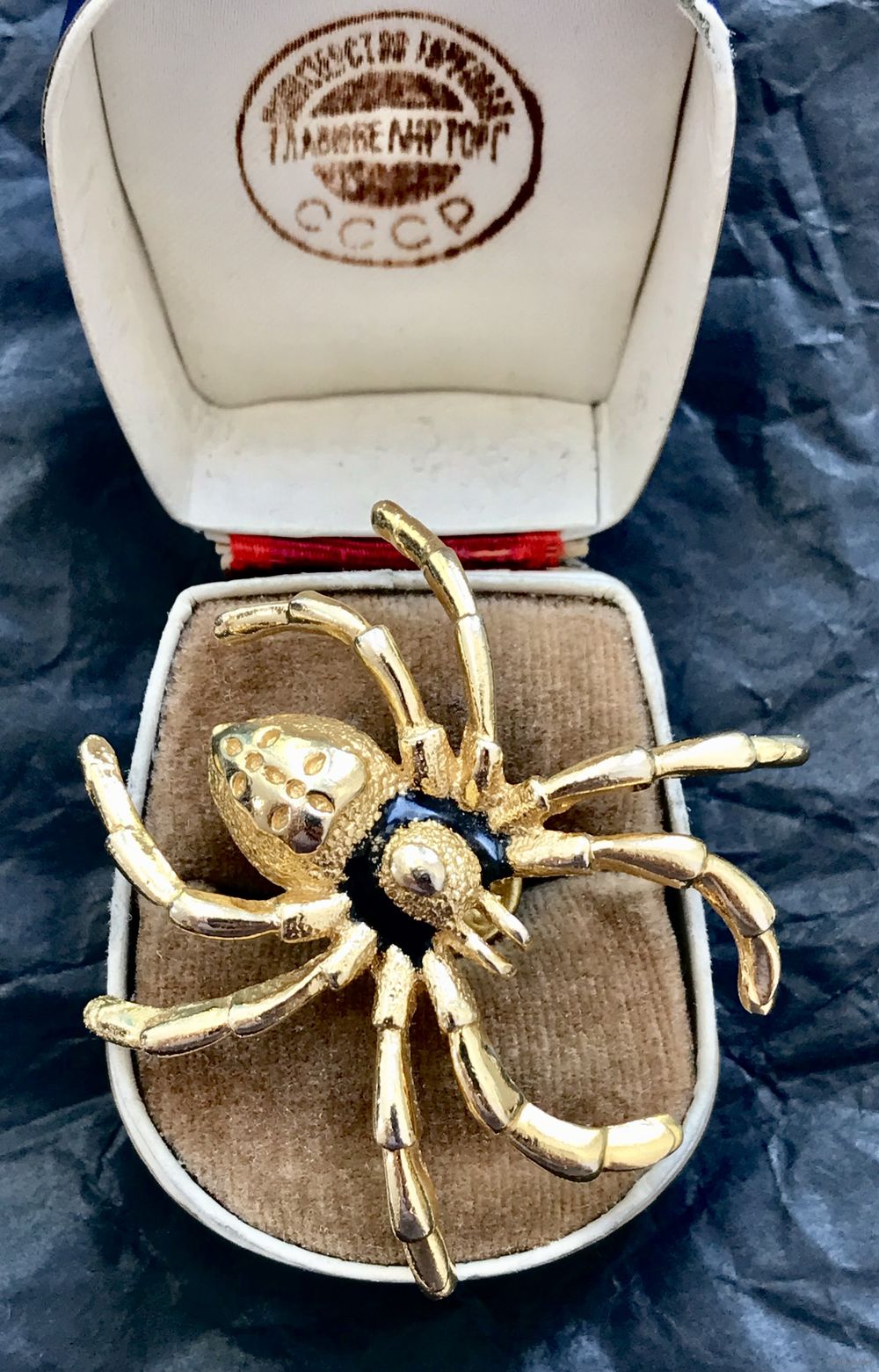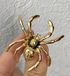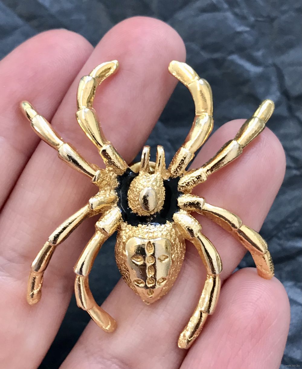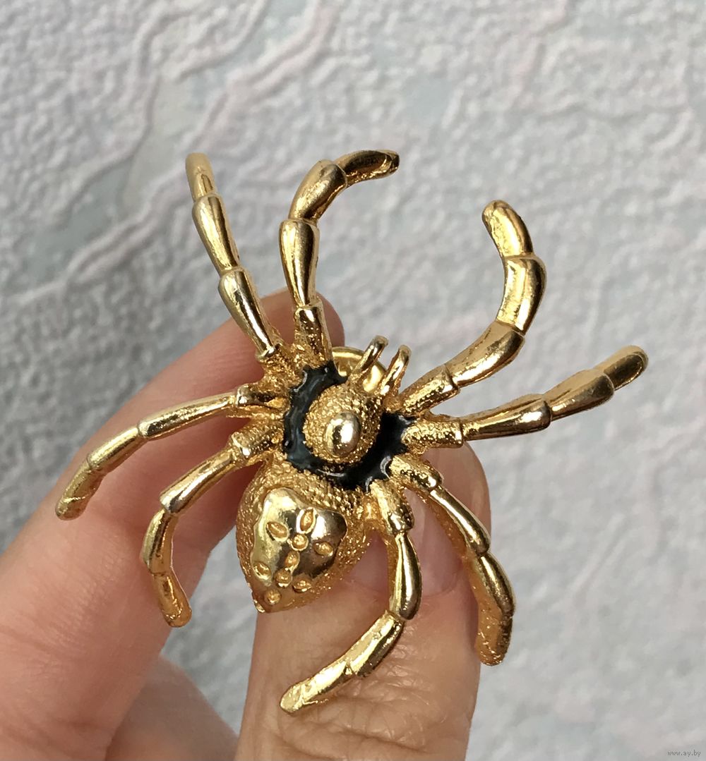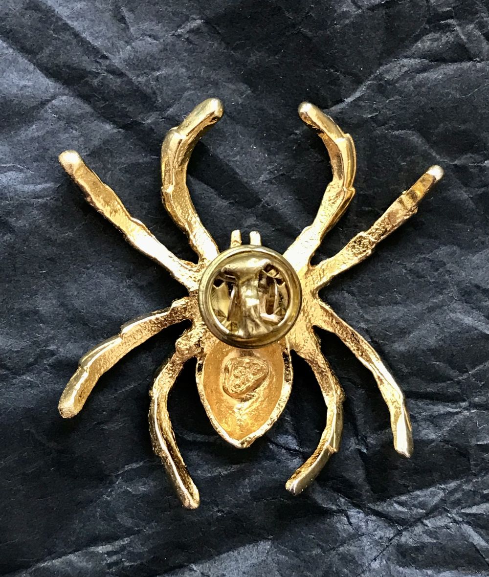 Крупная винтажная брошь-пин в виде паука из металла золотого тона, лицевая сторона украшена эмалью чёрного цвета. Размер броши 4,5х4,5см. Тяжёленькая. Брошь маркирована, но мне не удалось ее атрибутировать. Состояние хорошее.