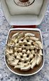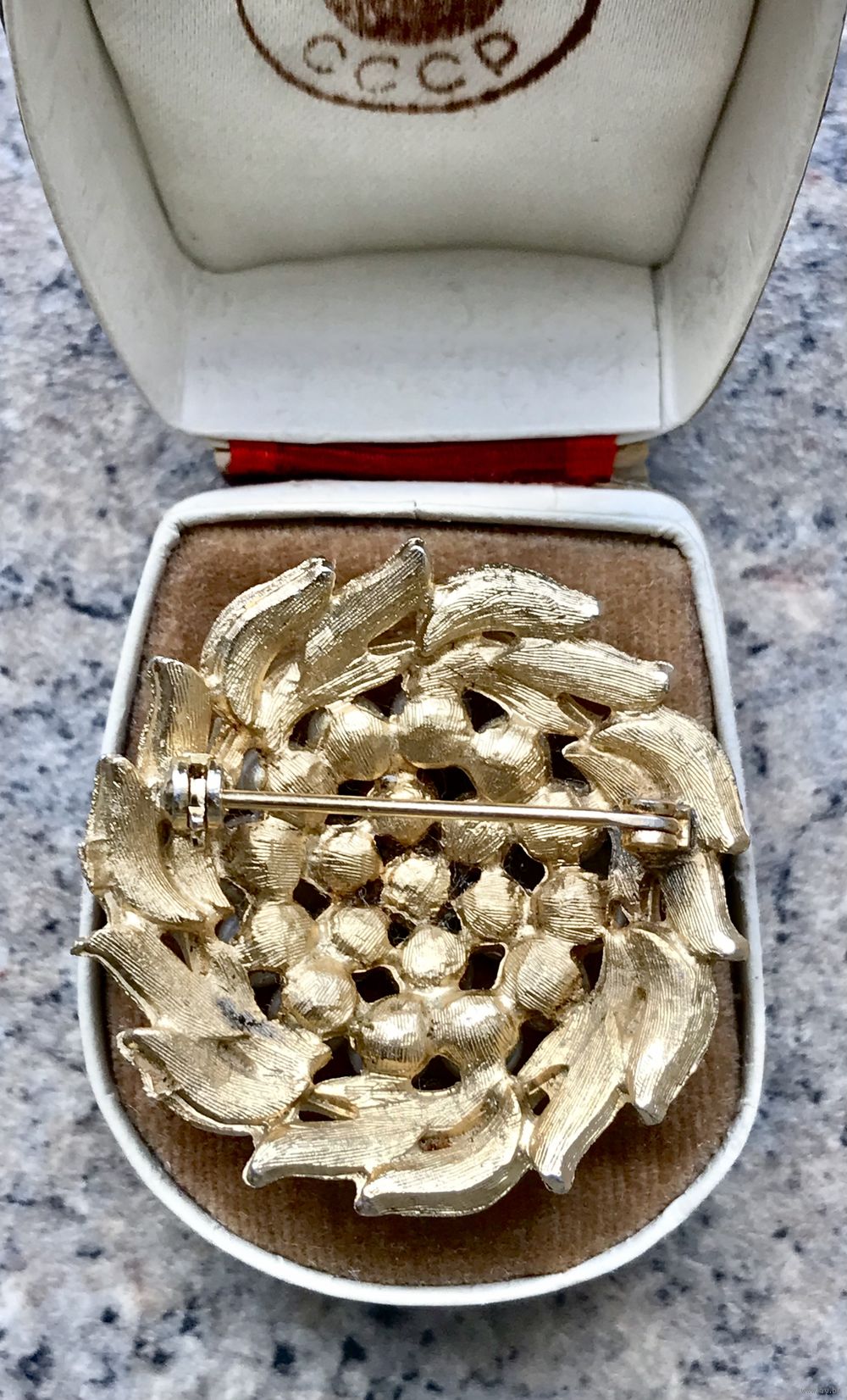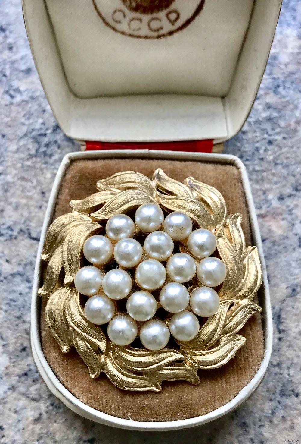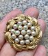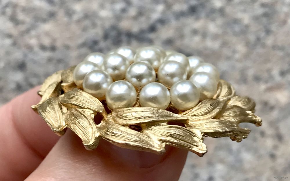 Винтажная брошь из металла золотистого тона и вставок под жемчуг (пластик). На нескольких вставках есть незначительные потёртости. Диаметр броши 3,5см. Не маркирована.