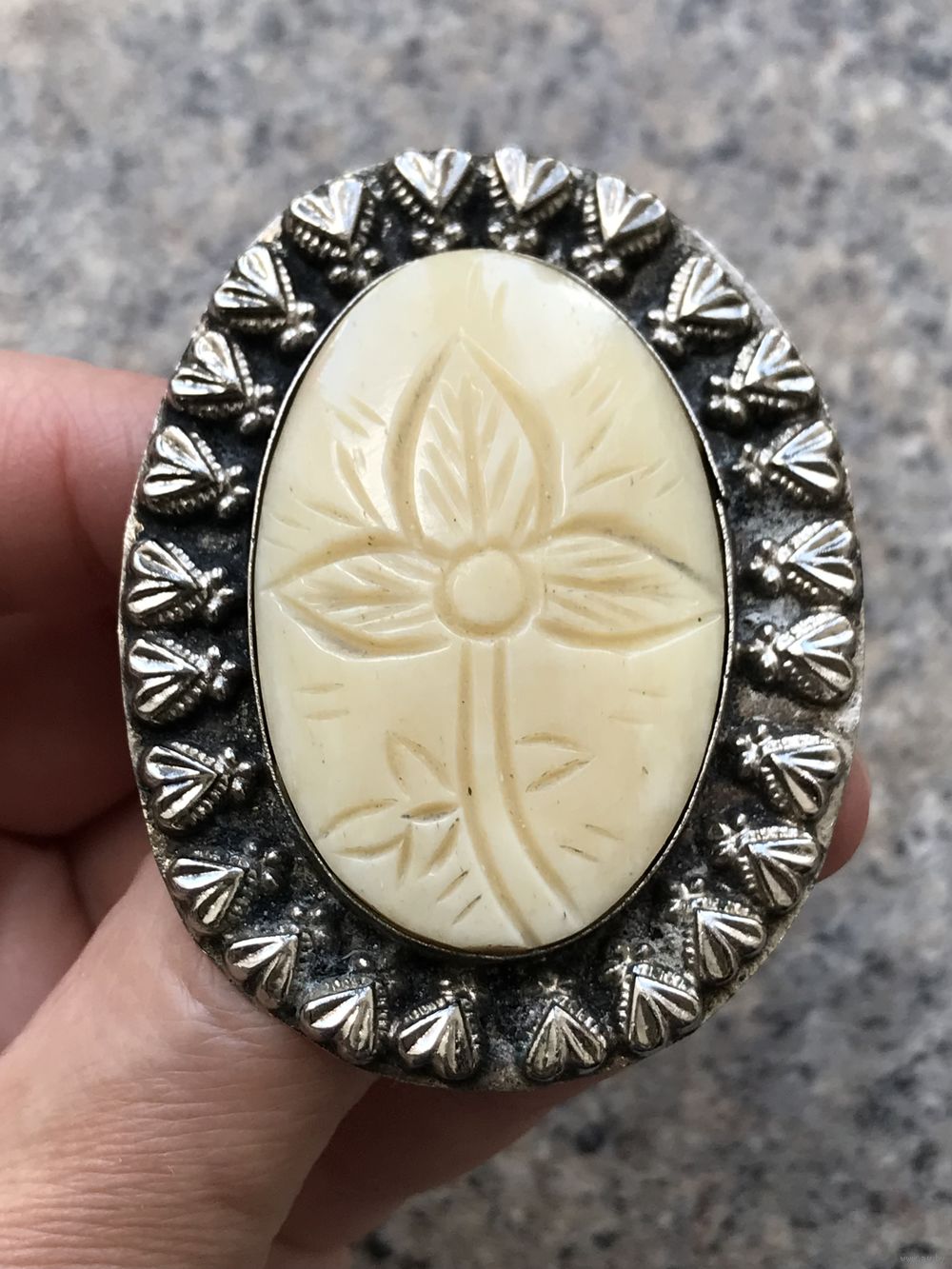 Крупная винтажная брошь с основой из металла серебристого тона. Вставка из кости с резьбой. Размер броши 5,5х4,3см., размер вставки 4х2,7см.