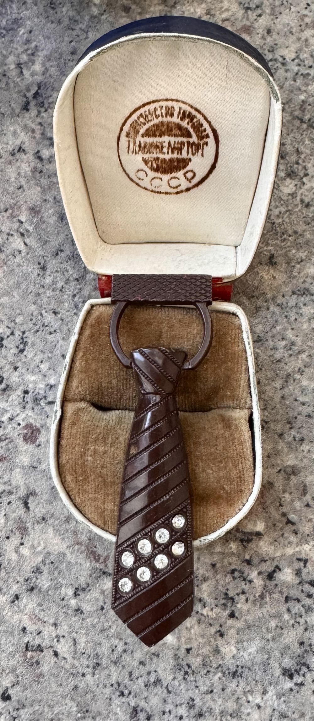 Винтажная брошь из целлулоида в виде галстука, лицевая сторона украшена кристаллами. Высота 6,8см. Состояние хорошее.