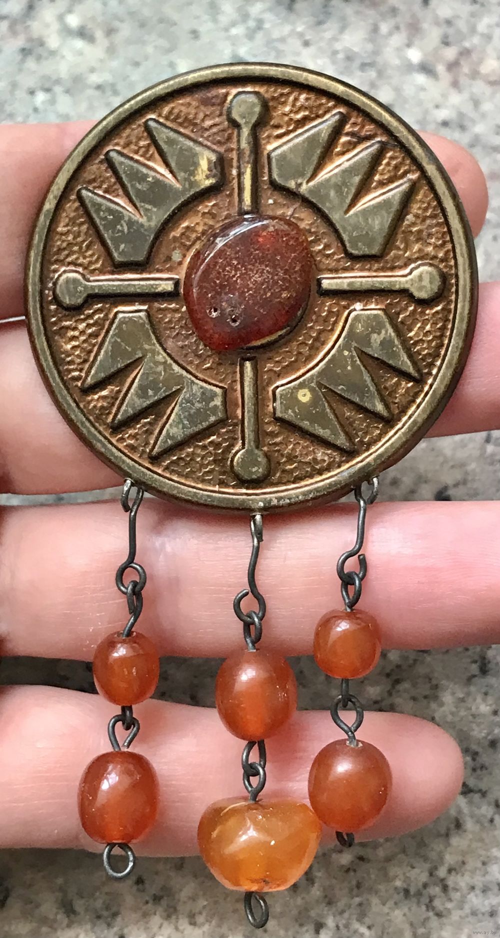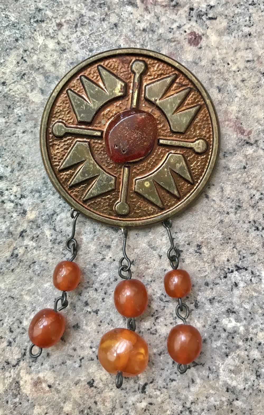 Винтажная брошь из меди и янтарных вставок. Сделана в Прибалтике в 70-е гг. Высота 9см., диаметр 4,5см. Состояние хорошее.