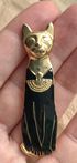 Крупная брошь из металла золотого тона, лицевая сторона покрыта эмалью чёрного цвета. Высота кошки 6,5см. Можно носить как кулон. Состояние хорошее. Тяжёленькая.