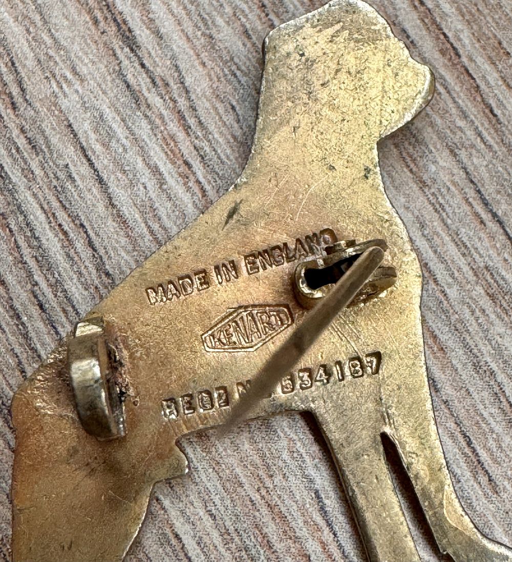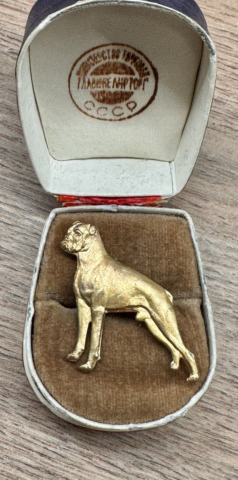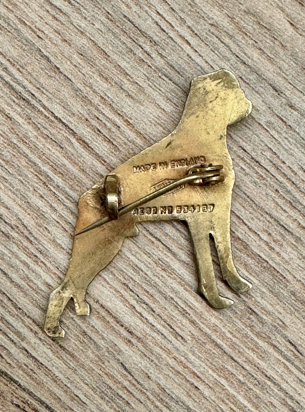 Небольшая винтажная брошь из металла золотого тона в виде собаки породы боксер. Брошь сделана в Англии компанией Kenart, которая производила украшения в виде животных с 1930-х до своего закрытия в 1970-х гг. Размер броши 3х4см. Маркирована. Состояние хорошее.