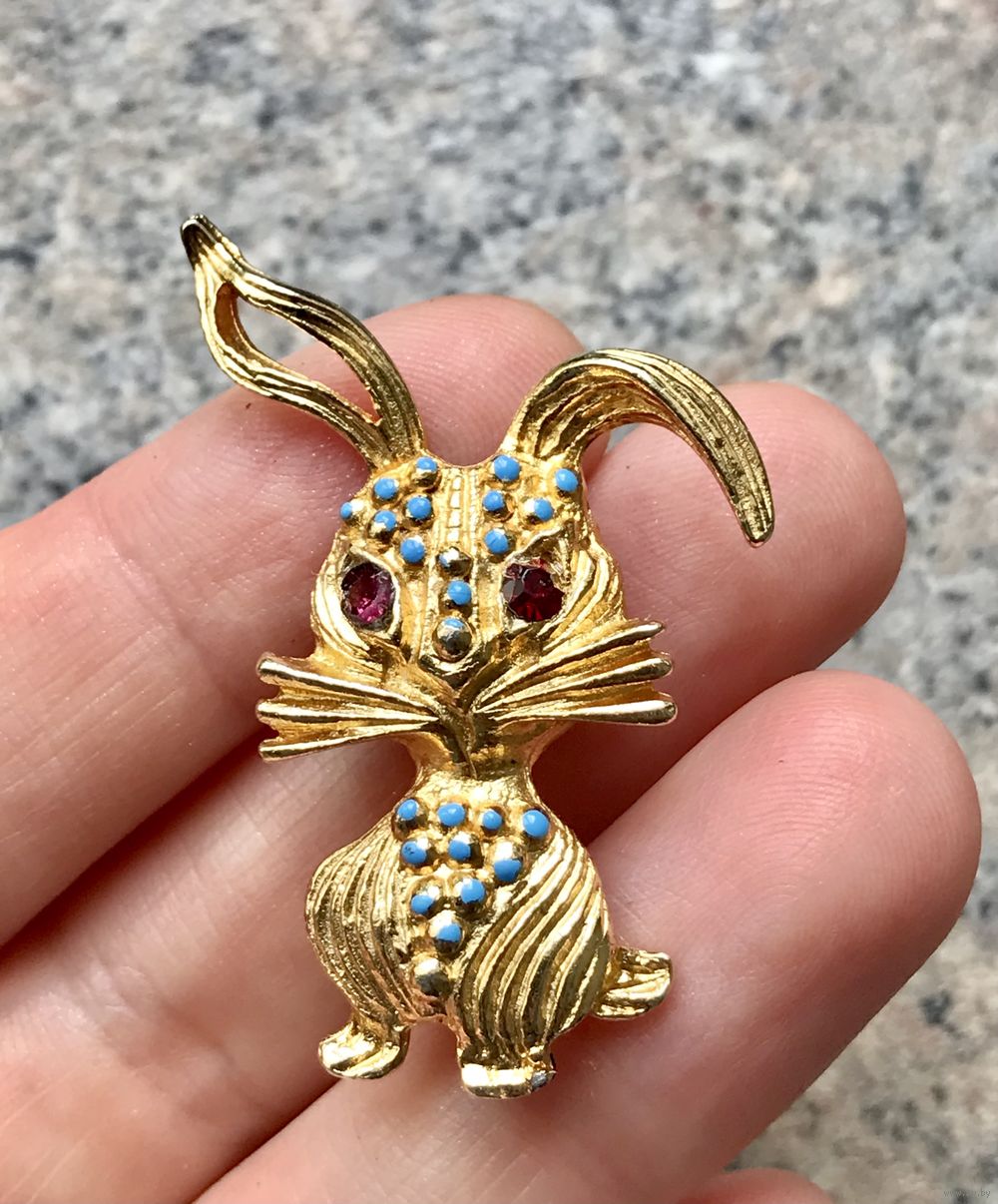 Винтажная брошь с основой из металла золотого тона. На лицевой стороне эмаль и кристаллы. Высота броши 4,3см. На металле незначительные потёртости.