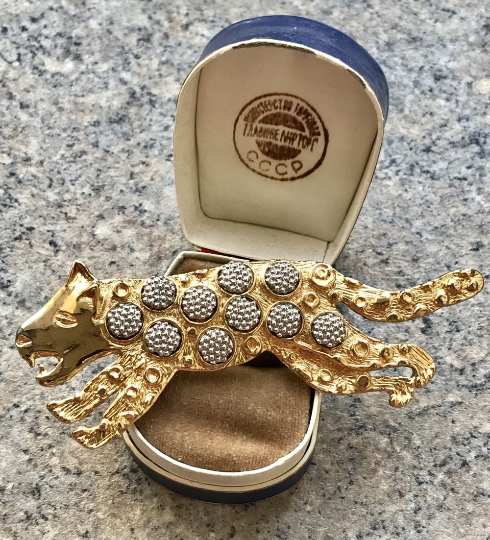 Крупная брошь с основой из металла золотого тона, на лицевой стороне элементы из металла серебристого тона. Длина броши 9,5см. На носу гепарда есть небольшой скол золотистого покрытия (учтено в цене).