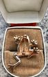 Небольшая брошь в виде лягушки выполнена из металла двух тонов, вставки- кристаллы, высота броши 3,5 см., состояние хорошее.