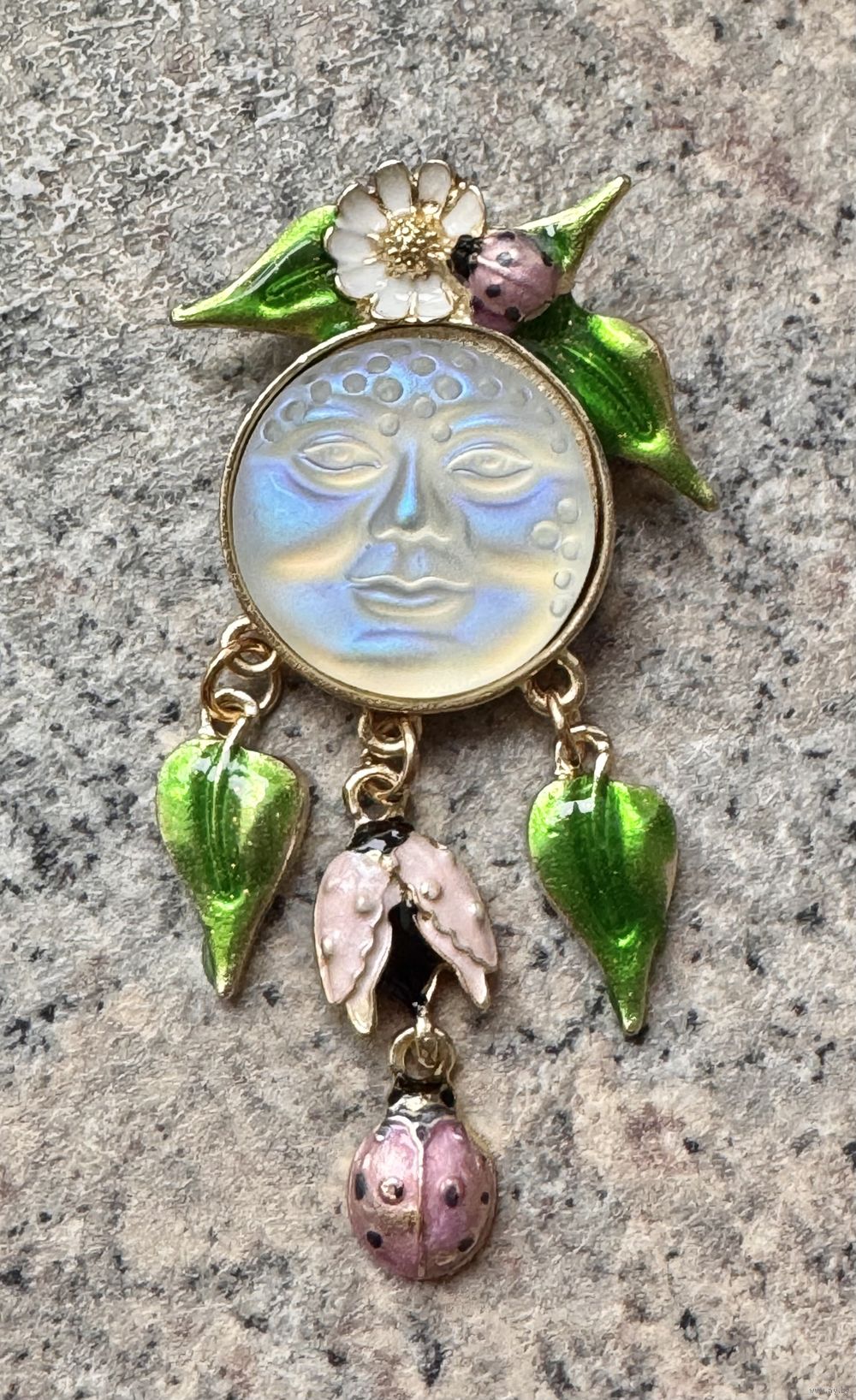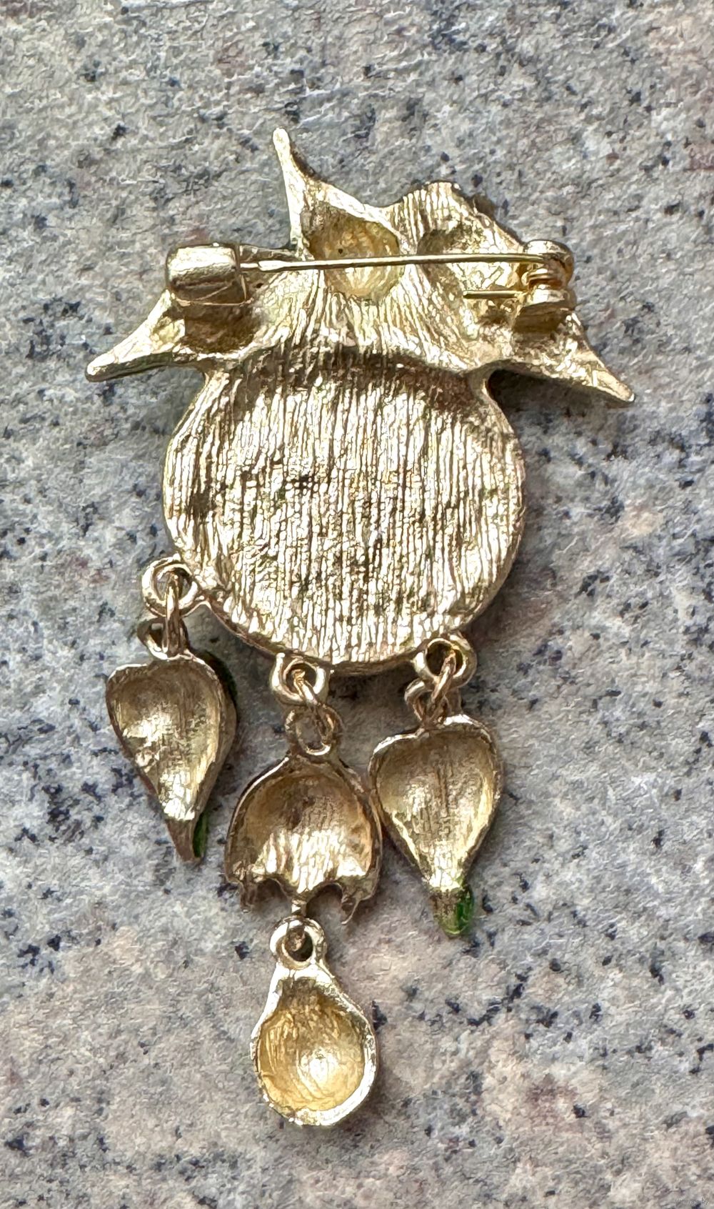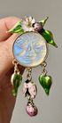 Крупная брошь в стиле Kirks Folly. Основа из металла золотого тона, на лицевой стороне центральная вставка из пластика, эмаль. Высота броши 8см. Состояние хорошее.