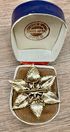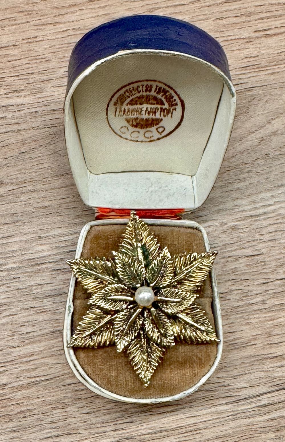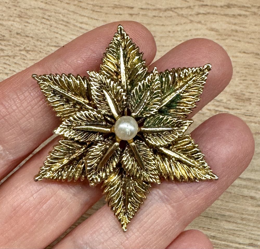 Винтажная брошь из металла золотистого тона, вставка из стекла под жемчуг (имеется небольшой сход перламутрового покрытия). Диаметр 4,5см. Тяжеленькая.