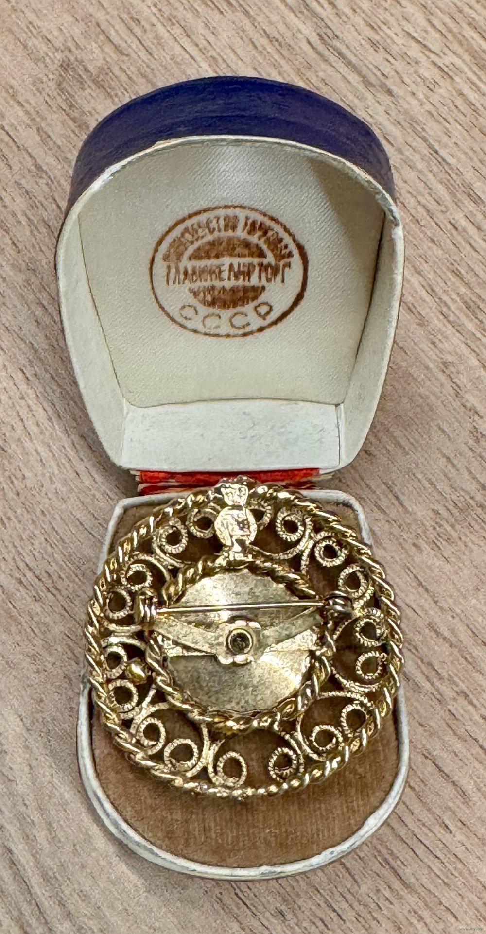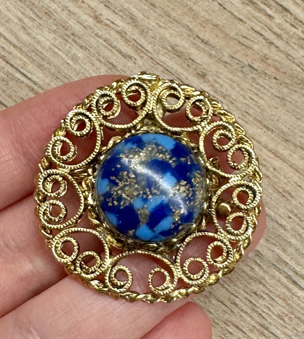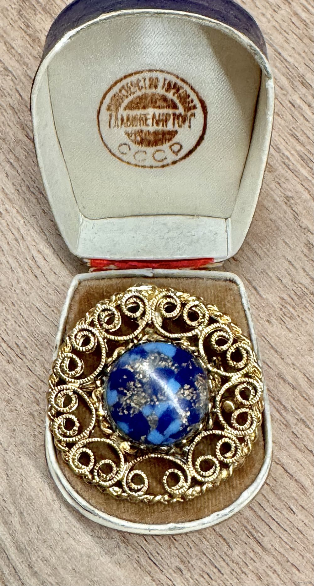 Винтажная брошь из металла золотого тона. Вставка из художественного стекла. Диаметр броши 4см., диаметр вставки 1,8см. На металле местами имеются небольшие потемнения.