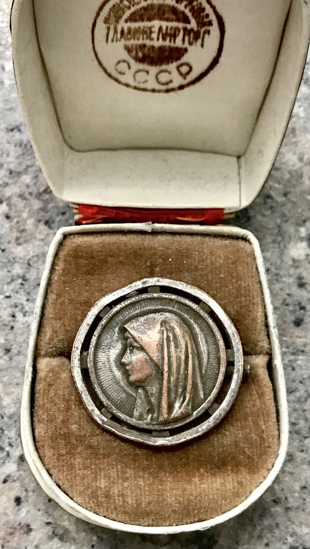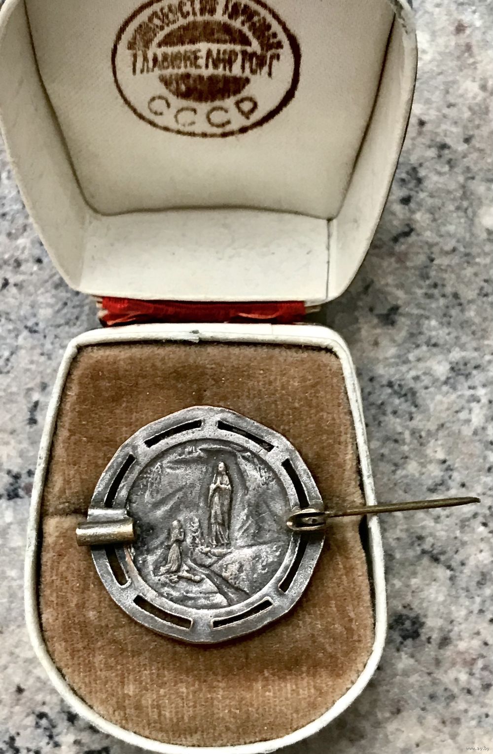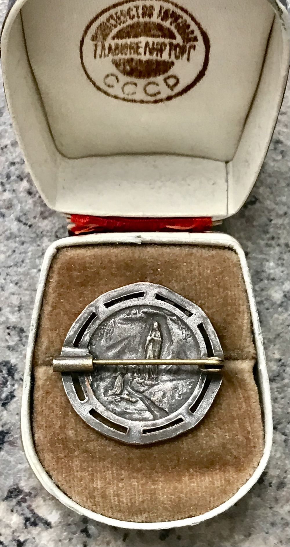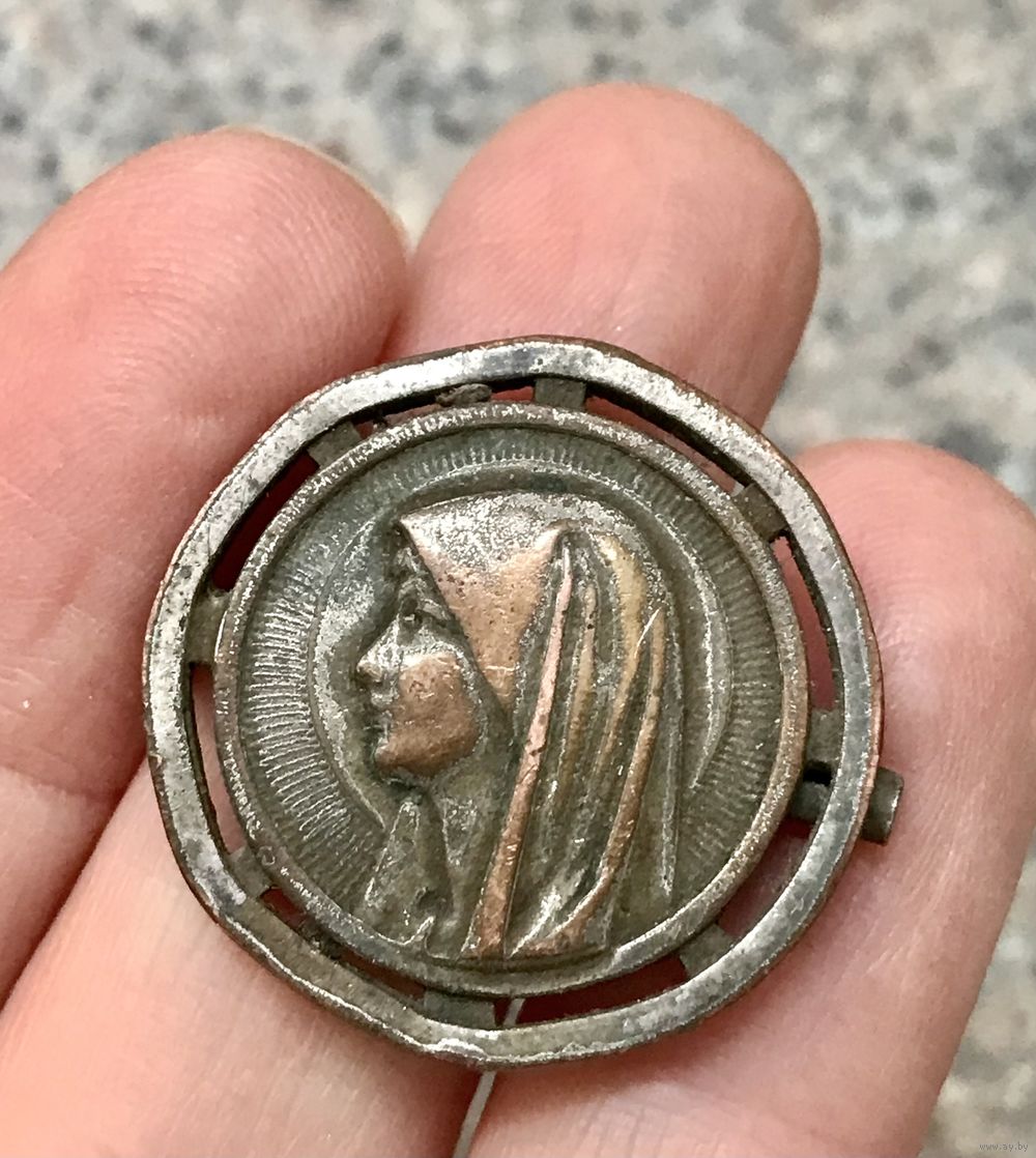 Винтажная брошь с изображением Девы Марии на лицевой стороне и явлением Девы Марии в Лурде с обратной стороны. Изготовлена из металла с серебрением (местами потёртости на металле). Замок тромбон, частично сломан, но брошь можно застегнут. Диаметр броши 2,6см. Все нюансы учтены в цене.