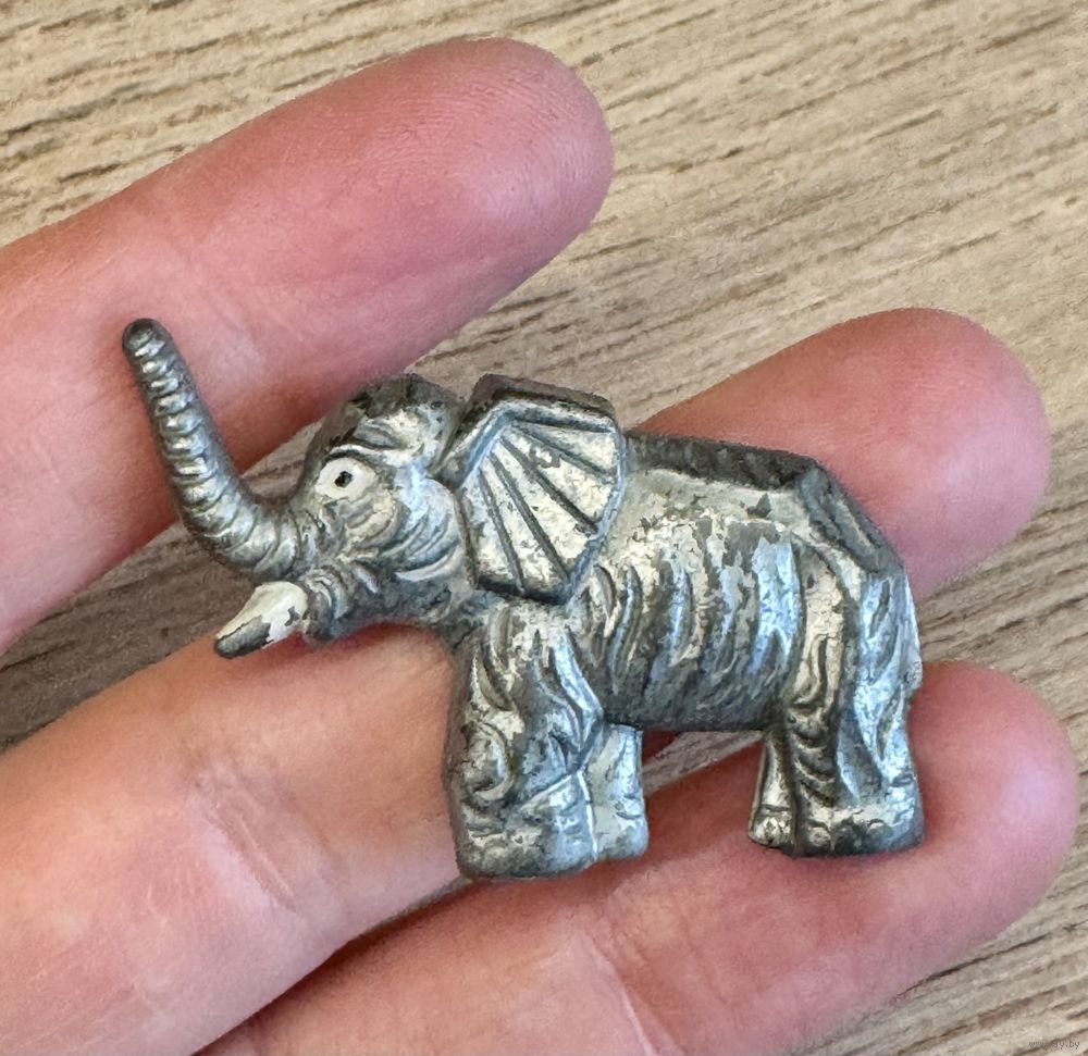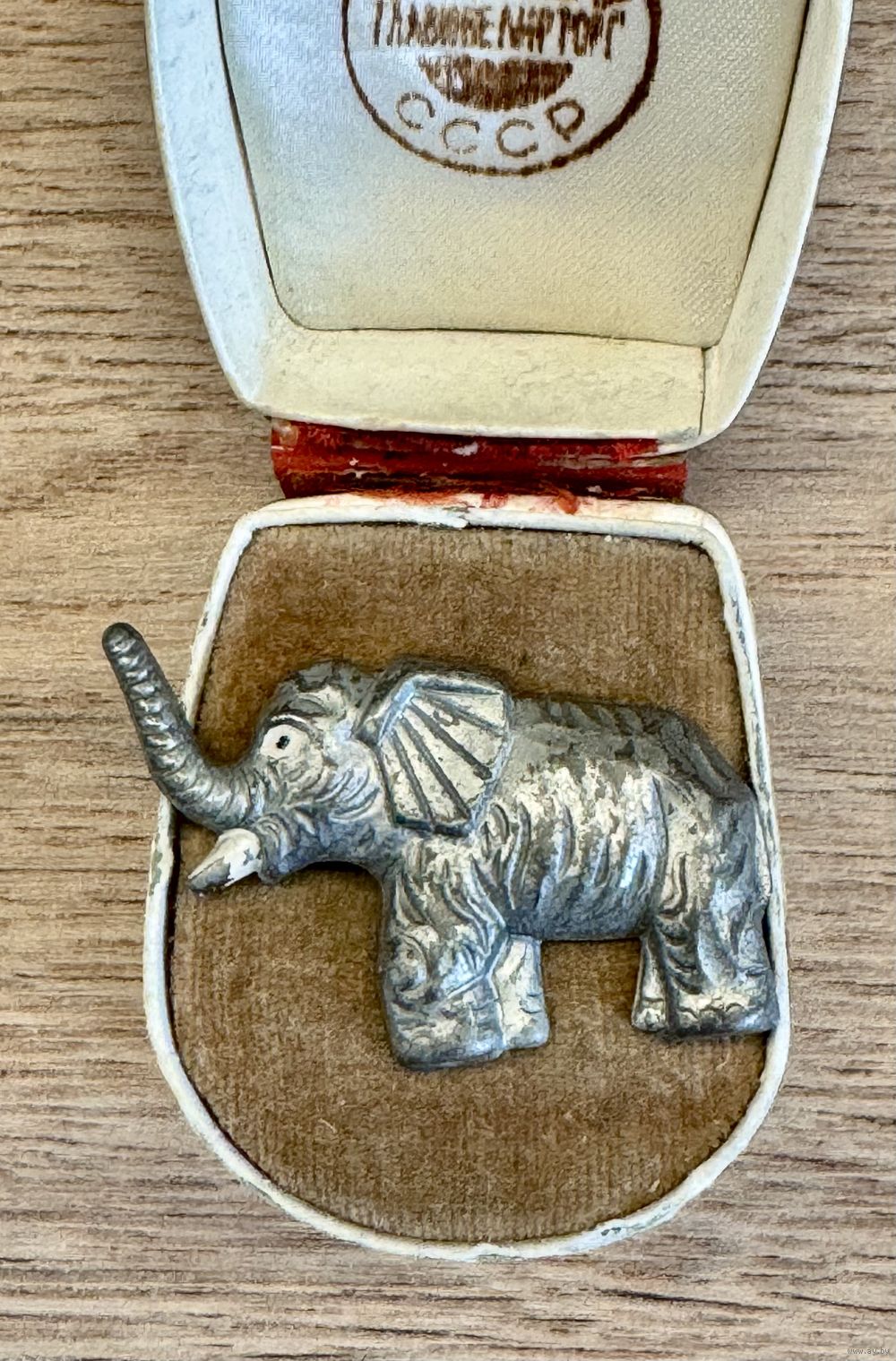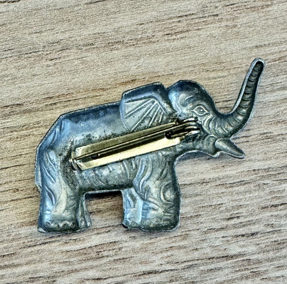 Винтажная брошь из металла серебристого тона в виде слона. На бивне остатки белой эмали. Размер 5х2,5см. Общее состояние хорошее.
