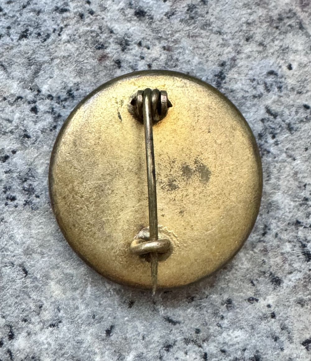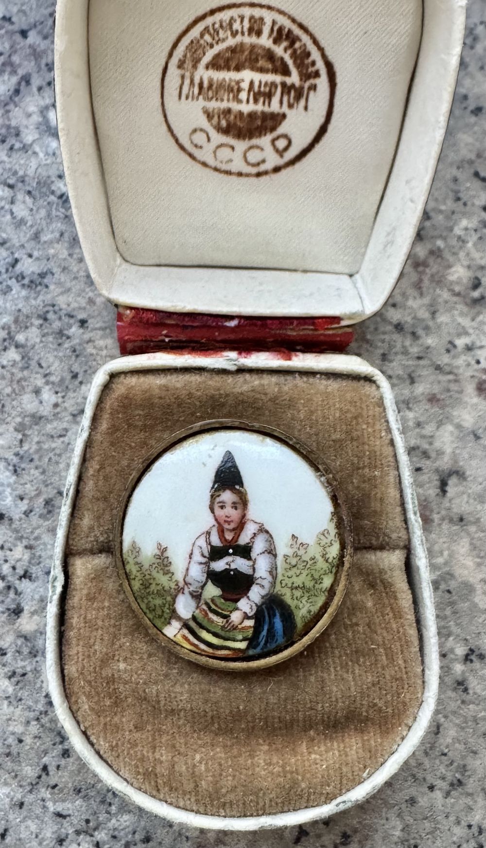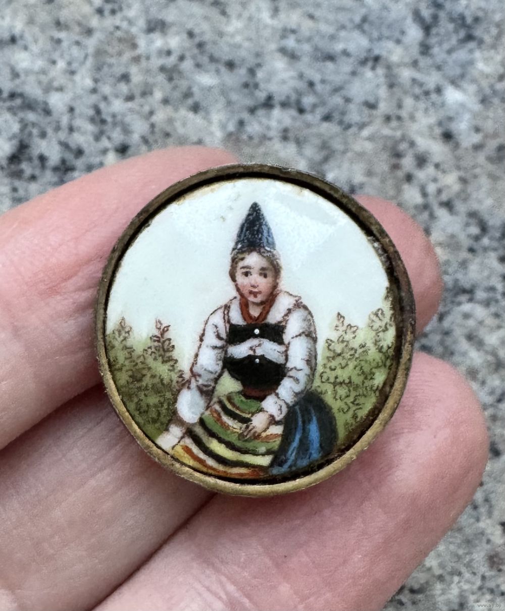 Небольшая антикварная брошь с основой из латуни, вставка из фарфора с ручной росписью. Диаметр 2,4см. На рисунке имеются небольшие потертости, на металле потемнения.
