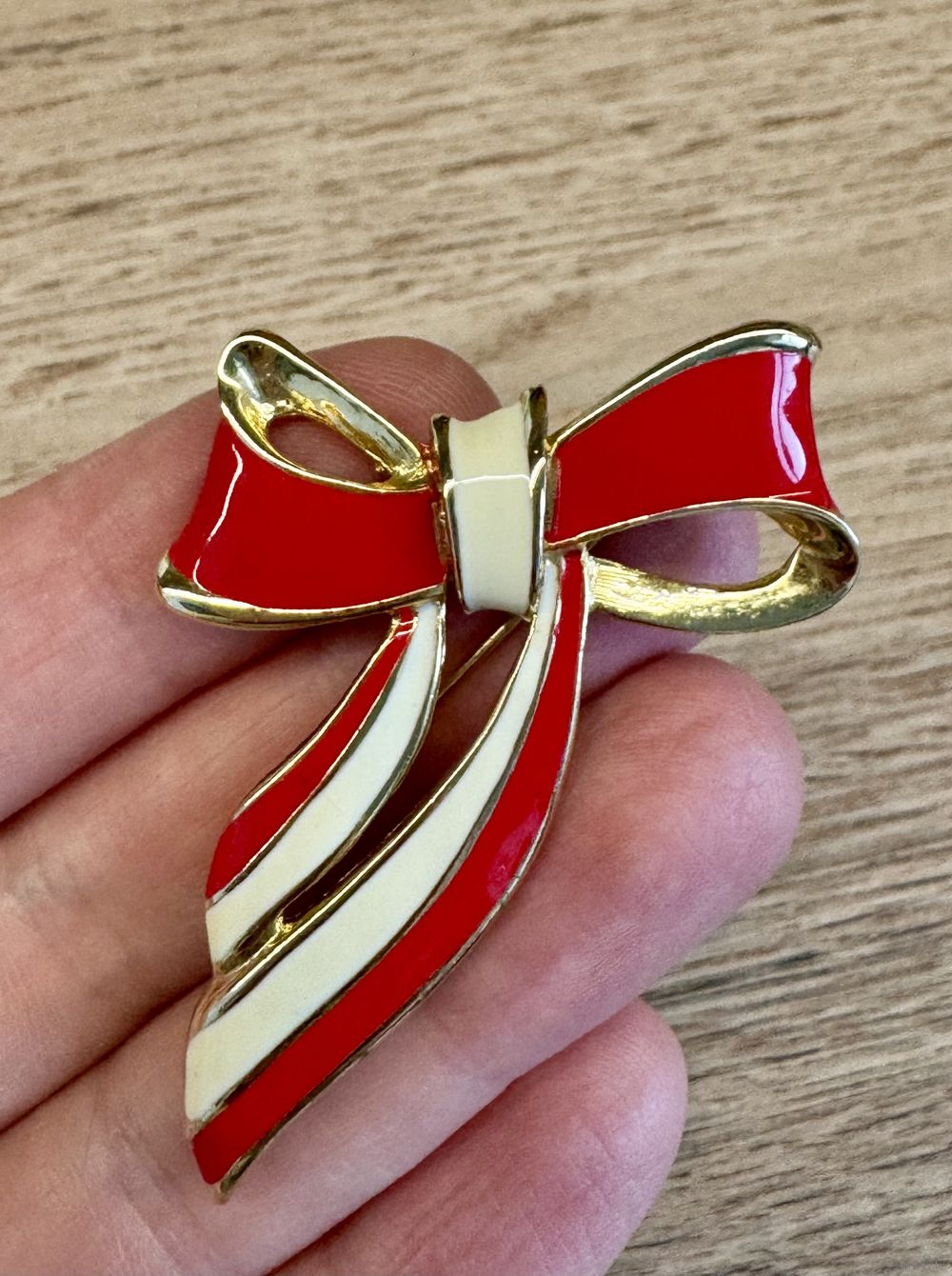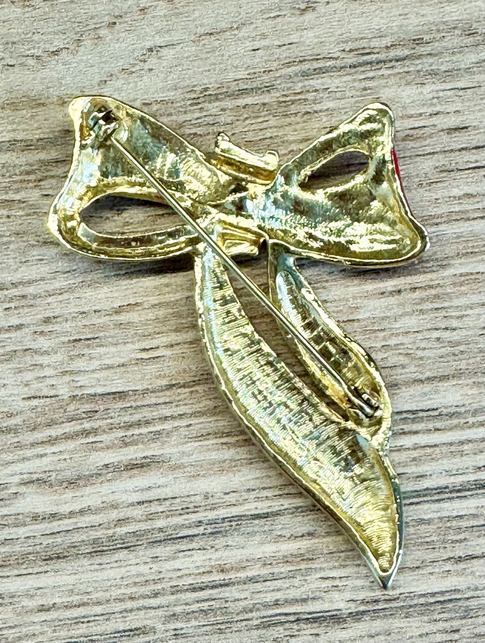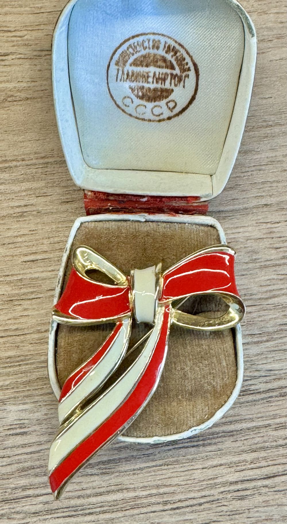 Винтажная брошь в виде банта. Основа из металла золотого тона, лицевая сторона украшена эмалью. Размер 6,3х4см. Состояние хорошее.
