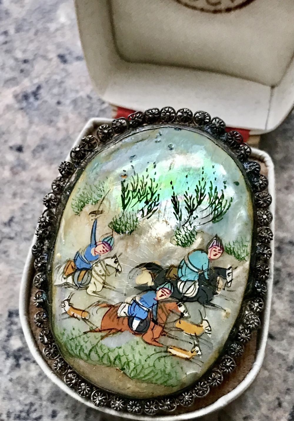 Антикварная брошь, первая половина ХХ в., Персия. Основа из металла серебристого тона (возможно серебро), вставка перламутр, ручная роспись. Застёжка с-формы из меди.Размер броши 5х3,5см., вставка 4х3см. Для своих лет состояние хорошее.