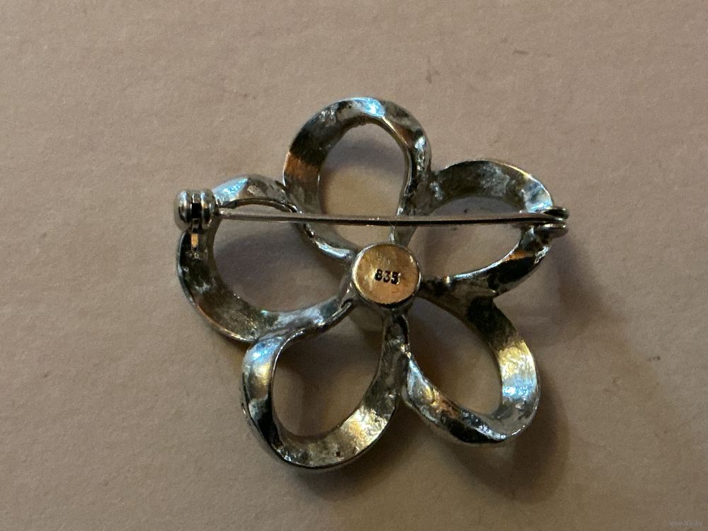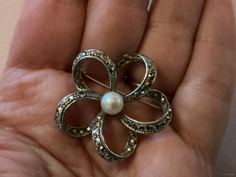 Красивая старинная брошь , серебро 835 проба , марказиты , жемчуг, диаметр 3,5 см