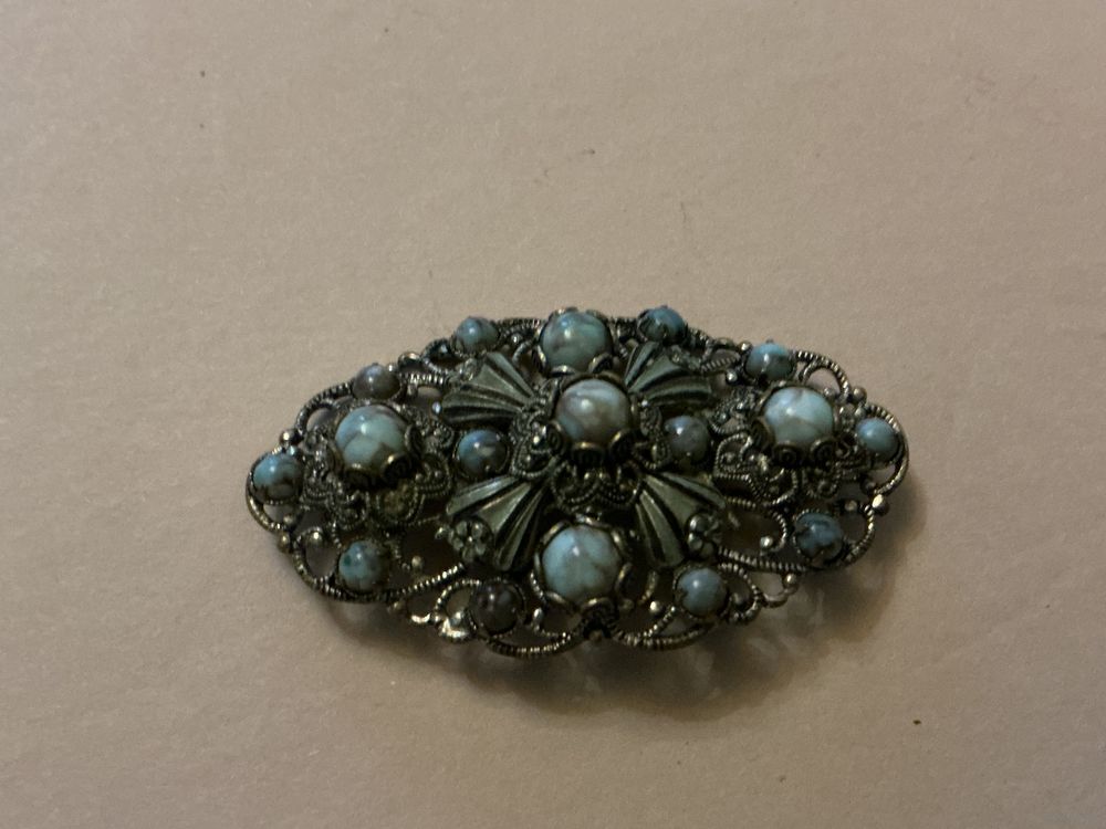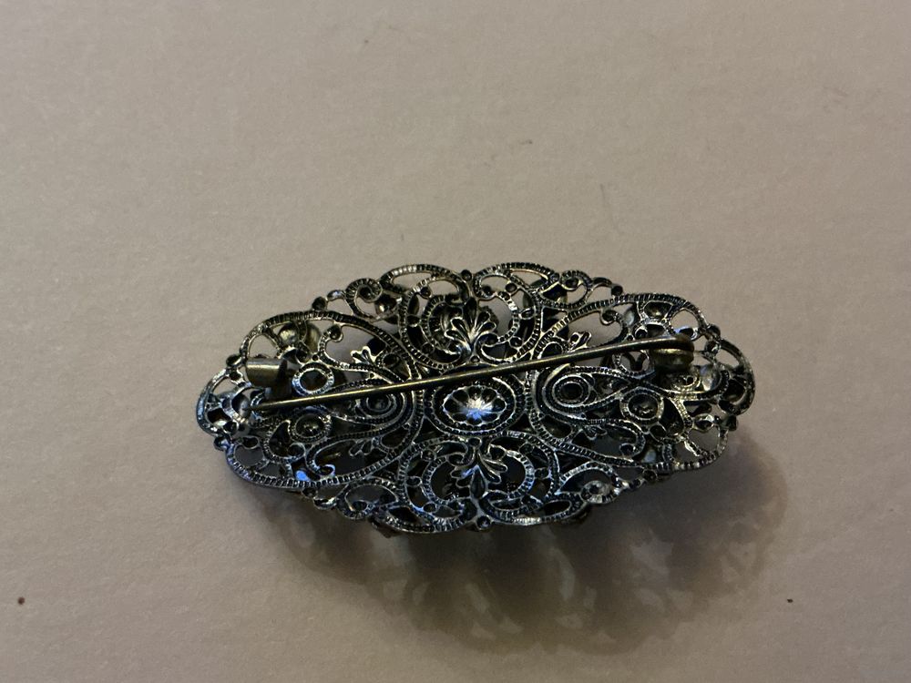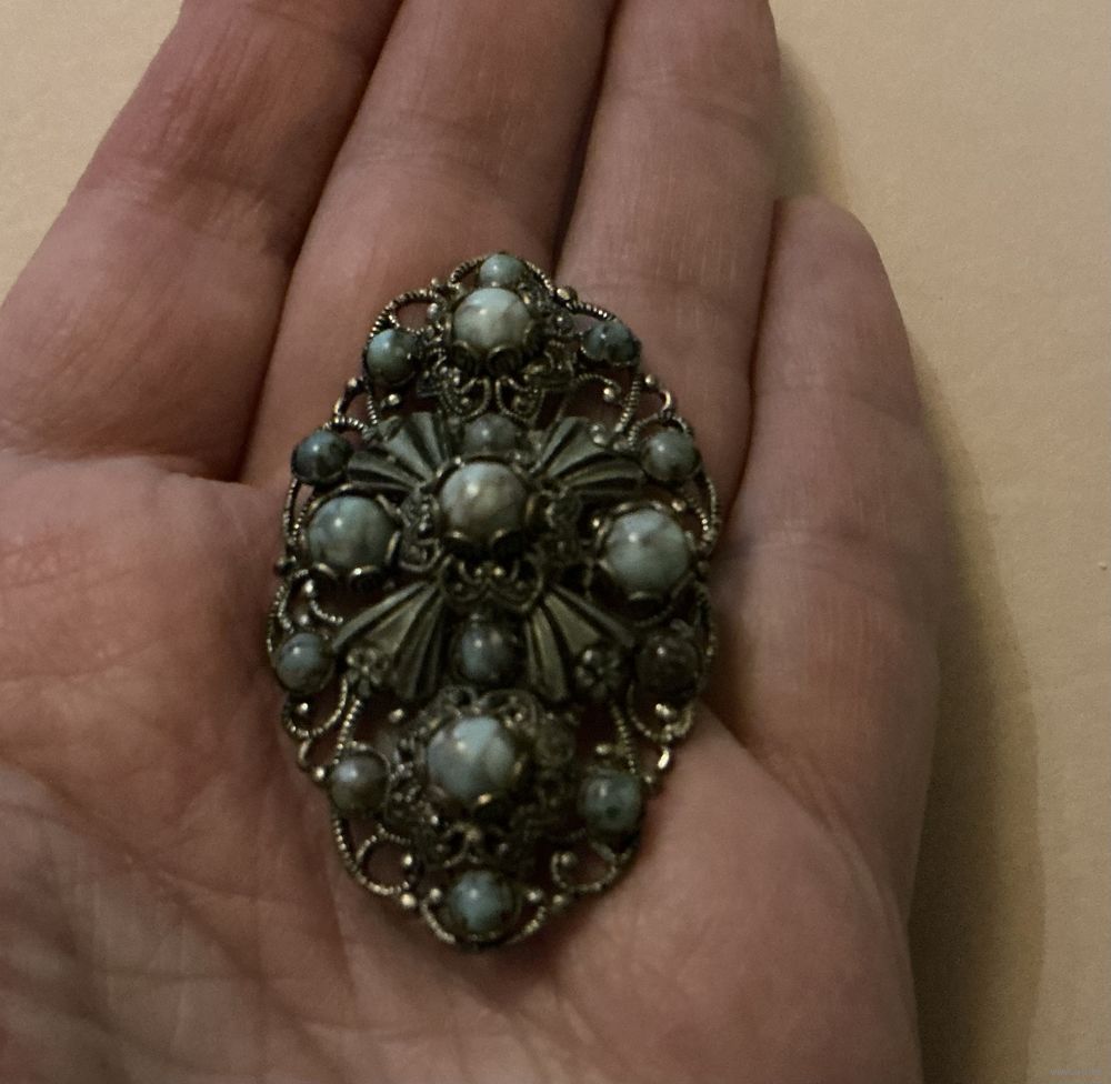 Красивая старинная брошь сложной работы , латунь серебрение эмаль , вставки пекинское стекло , 5 см х 3 см , застёжка старого типа С- образная