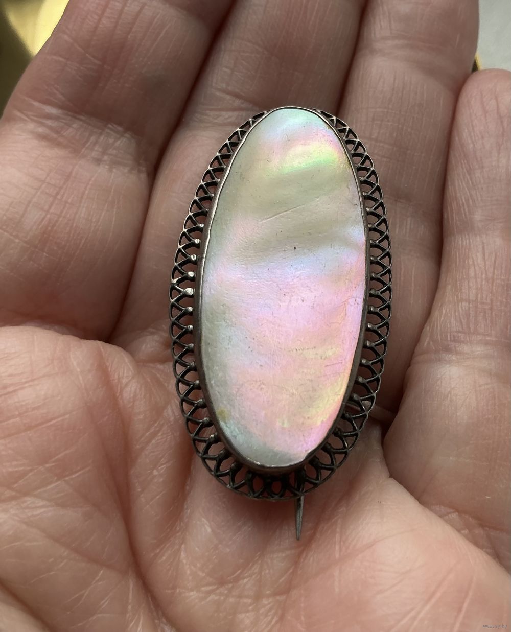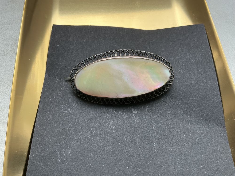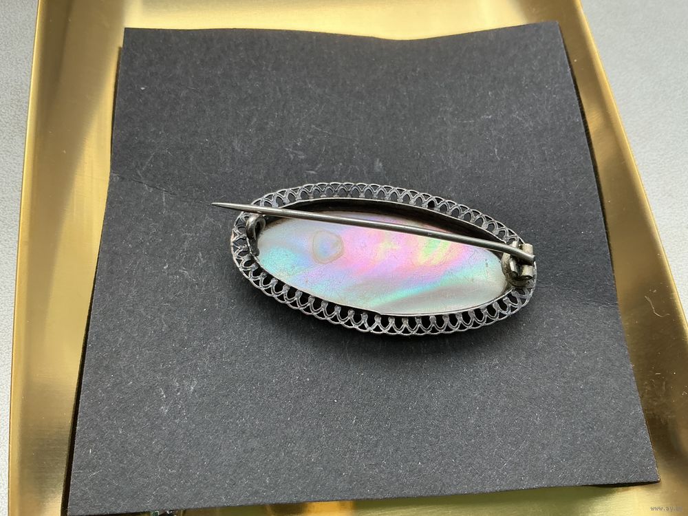 Красивая антикварная брошь , вставка натуральный перламутр, оправа серебро, застёжка С- образная, 4,5 см х 2,3 см