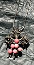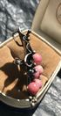 Крупная брошь-кулон из серебра 875пр. со вставками из родонита. Изготовлена в 1989г. в Свердловске (именник .9СЮ). Размер украшения 4,3х3,7см., диаметр шариков 0,6см. Состояние хорошее.