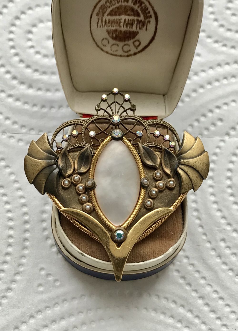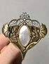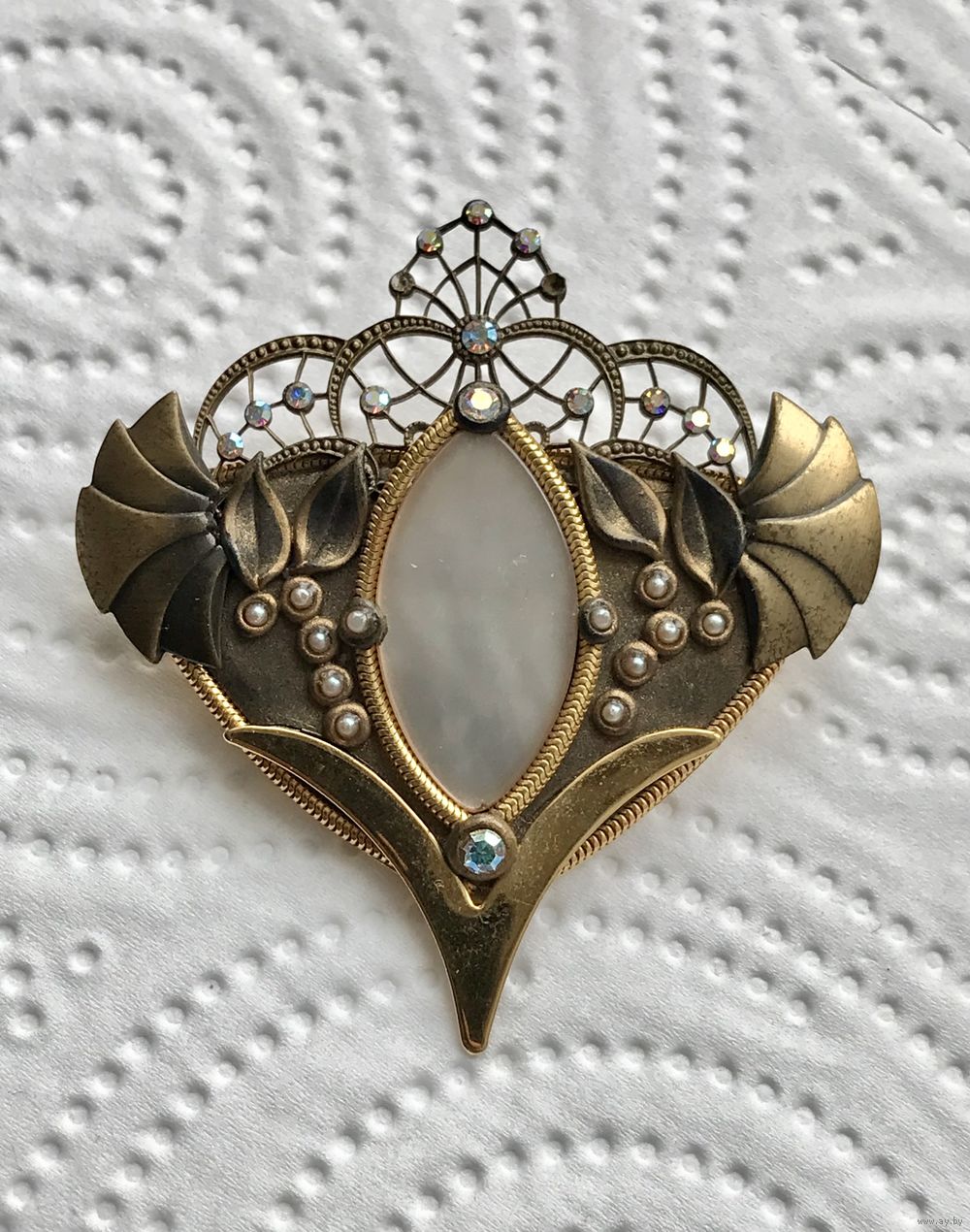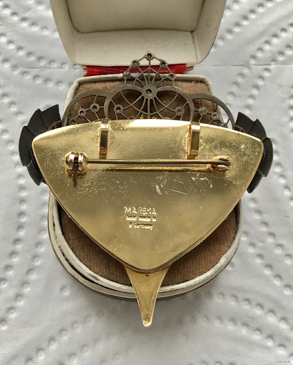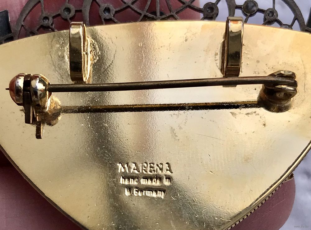Дизайнерская винтажная (70-80-е гг.) брошь-кулон бренда Marena в стиле ар-нуво. Германия. История этого бренда охватывает около 5-ти десятилетий (с 1940-х по 1990гг.) Все украшения этого бренда производились вручную, большинство в единственном экземпляре. Бижутерный сплав покрывался 18к золотом, использовались полудрагоценные камни, перламутр, кристаллы. Размер данной броши 6х5,5см. Не хватает двух самых мелких по размеру кристалликов. Маркирована.