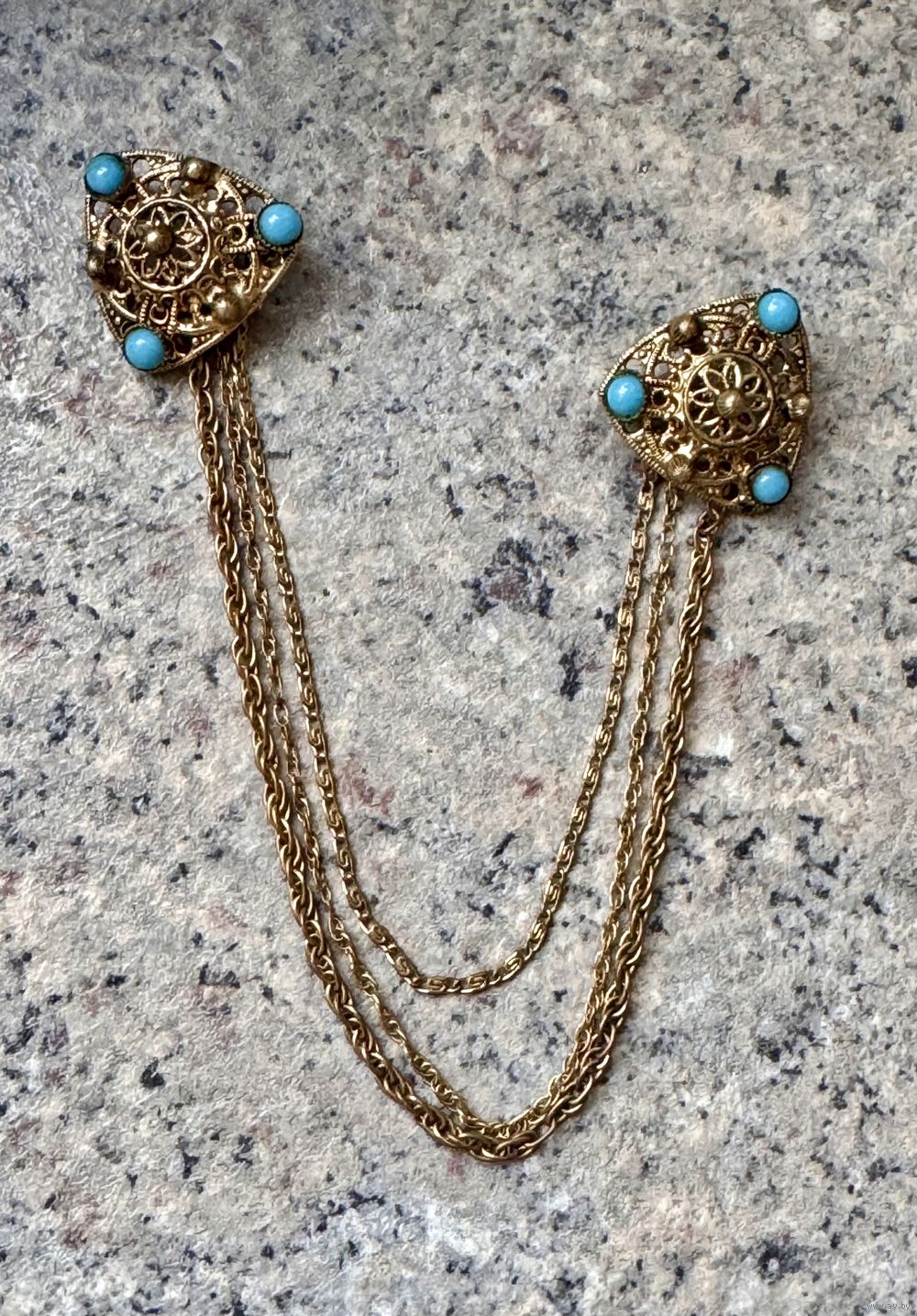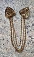 Винтажная брошь-шатлен из латуни, вставки цветное стекло. Размер треугольничков 2,3х2,3х2,3см., высота с нижней цепочкой 9,5см. Состояние хорошее.