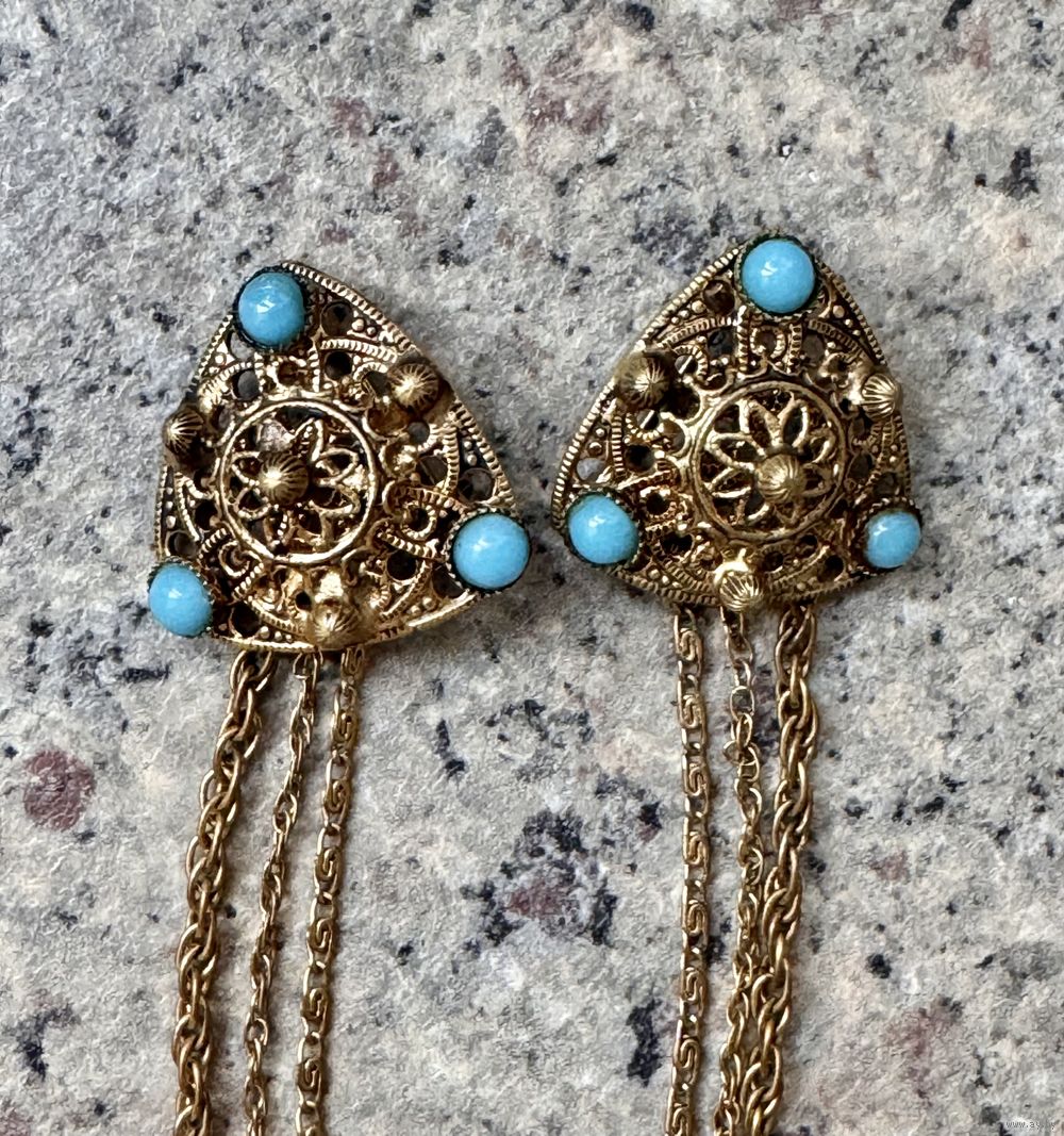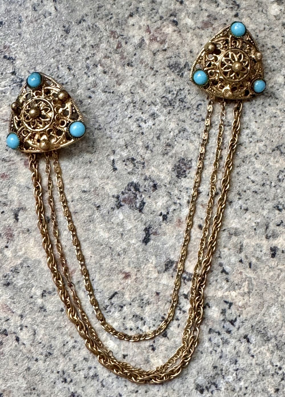 Винтажная брошь-шатлен из латуни, вставки цветное стекло. Размер треугольничков 2,3х2,3х2,3см., высота с нижней цепочкой 9,5см. Состояние хорошее.